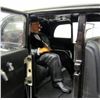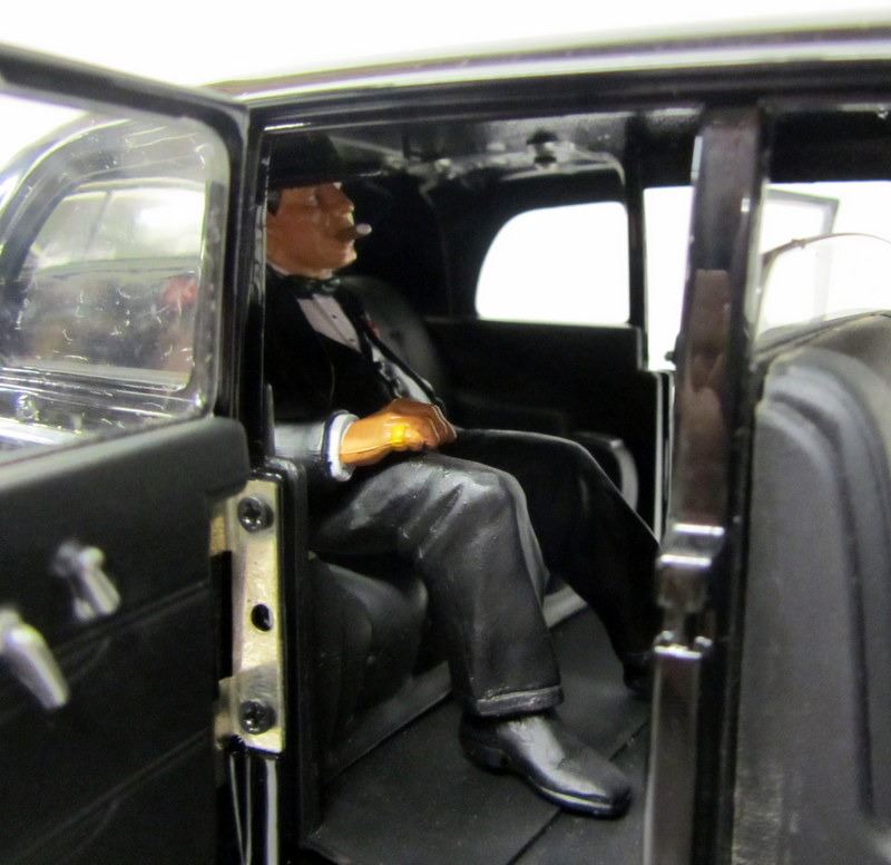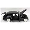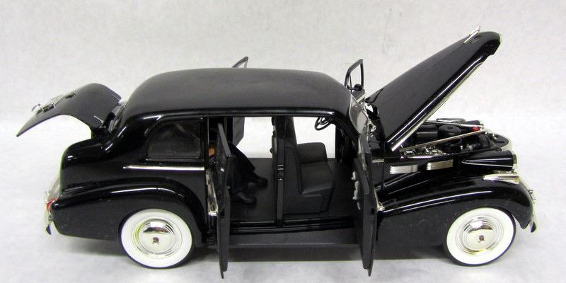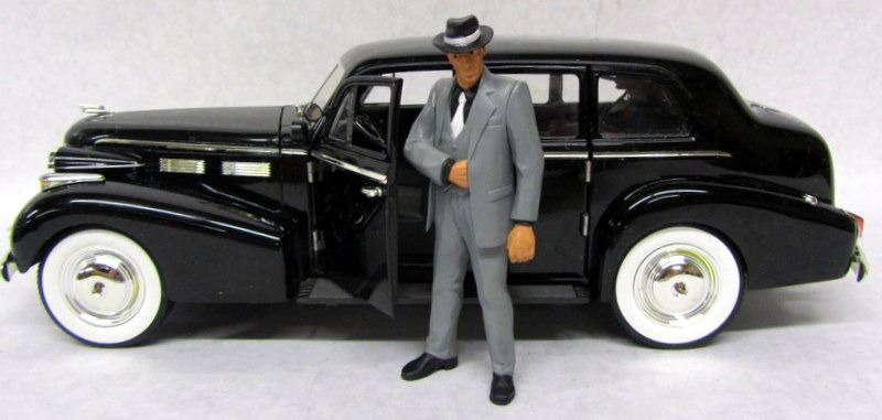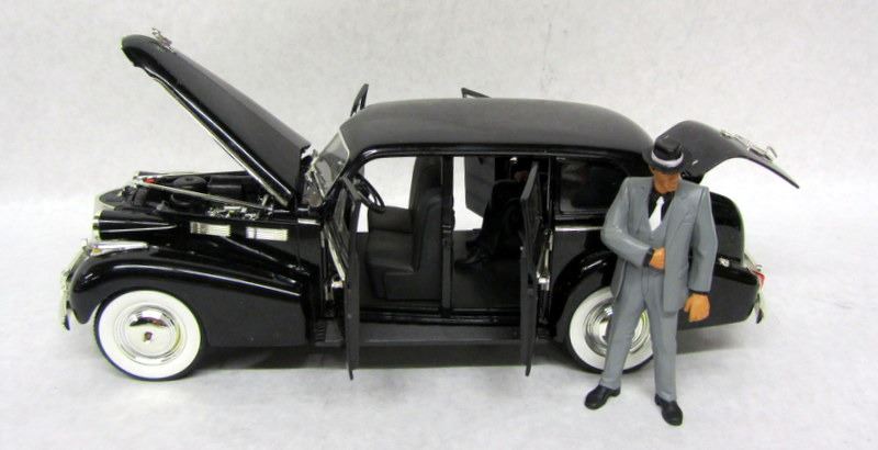 BLACK 1940 CADILLAC FLEETWOOD SERIES 75, 1:18, MADE BY JADA TOYS LICENSED MOVIE MEMORABILIA, COMES WITH GANGSTER FIGURINE.
