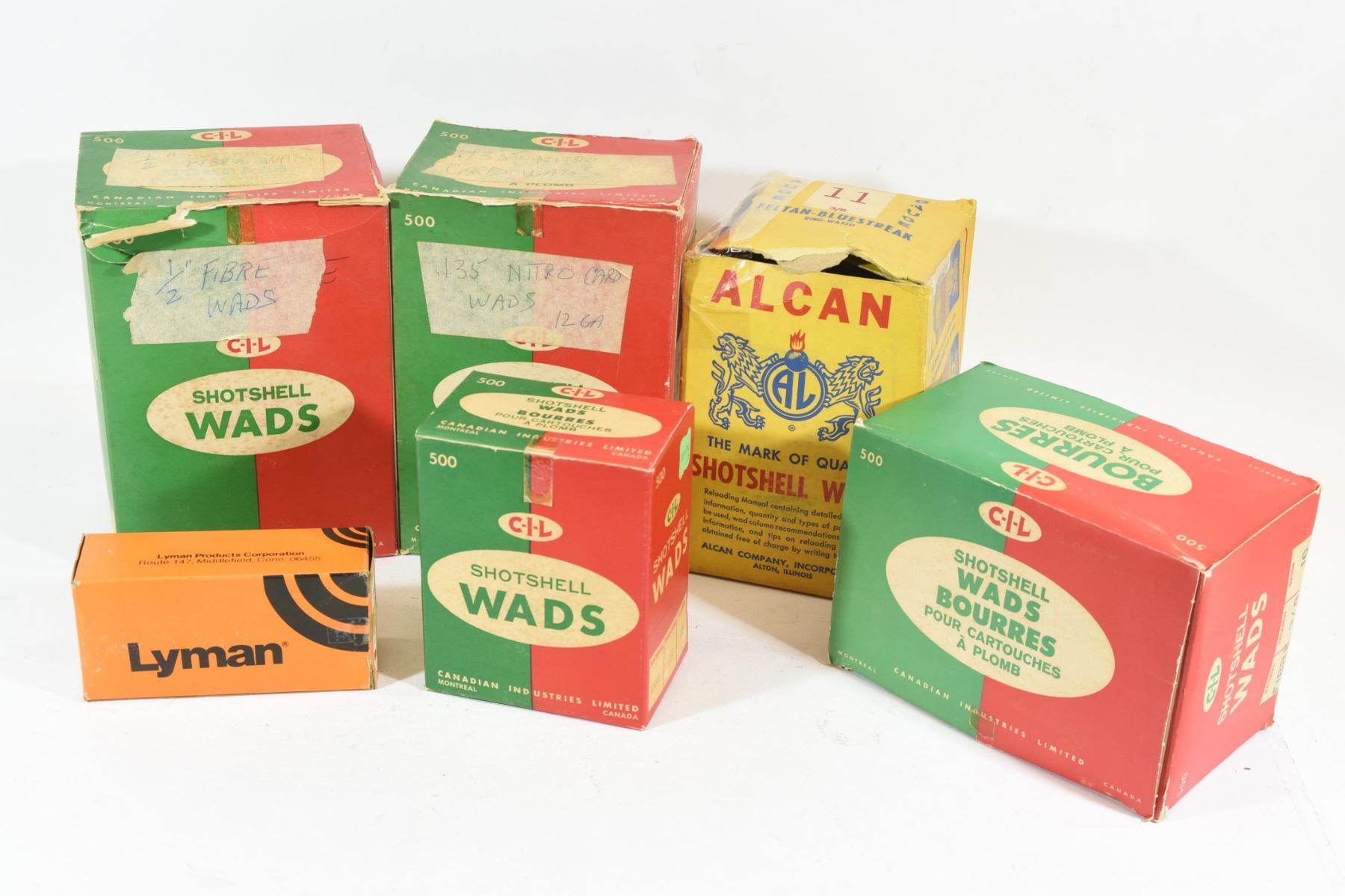 One box of CIL 12ga 1/2" thickness fiber wads. Two boxes of CIL 12ga 0.135 thickness card wads. One box of CIL 16ga 3/8" thickness fiber wads. One box of Alcan 11ga 3/8" thickness fiber wads. One box Lyman 45cal gas checks.