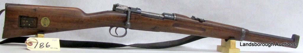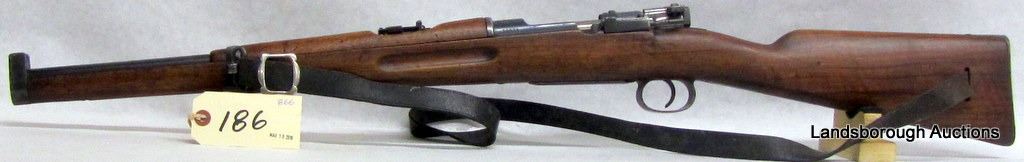 NON-RESTRICTED, BOLT ACTION, 7MM MAUSER, 18" BARREL, SN 10075. WOOD HAS NUMEROUS DENTS, BLUING IS GREY, BORE VERY GOOD.