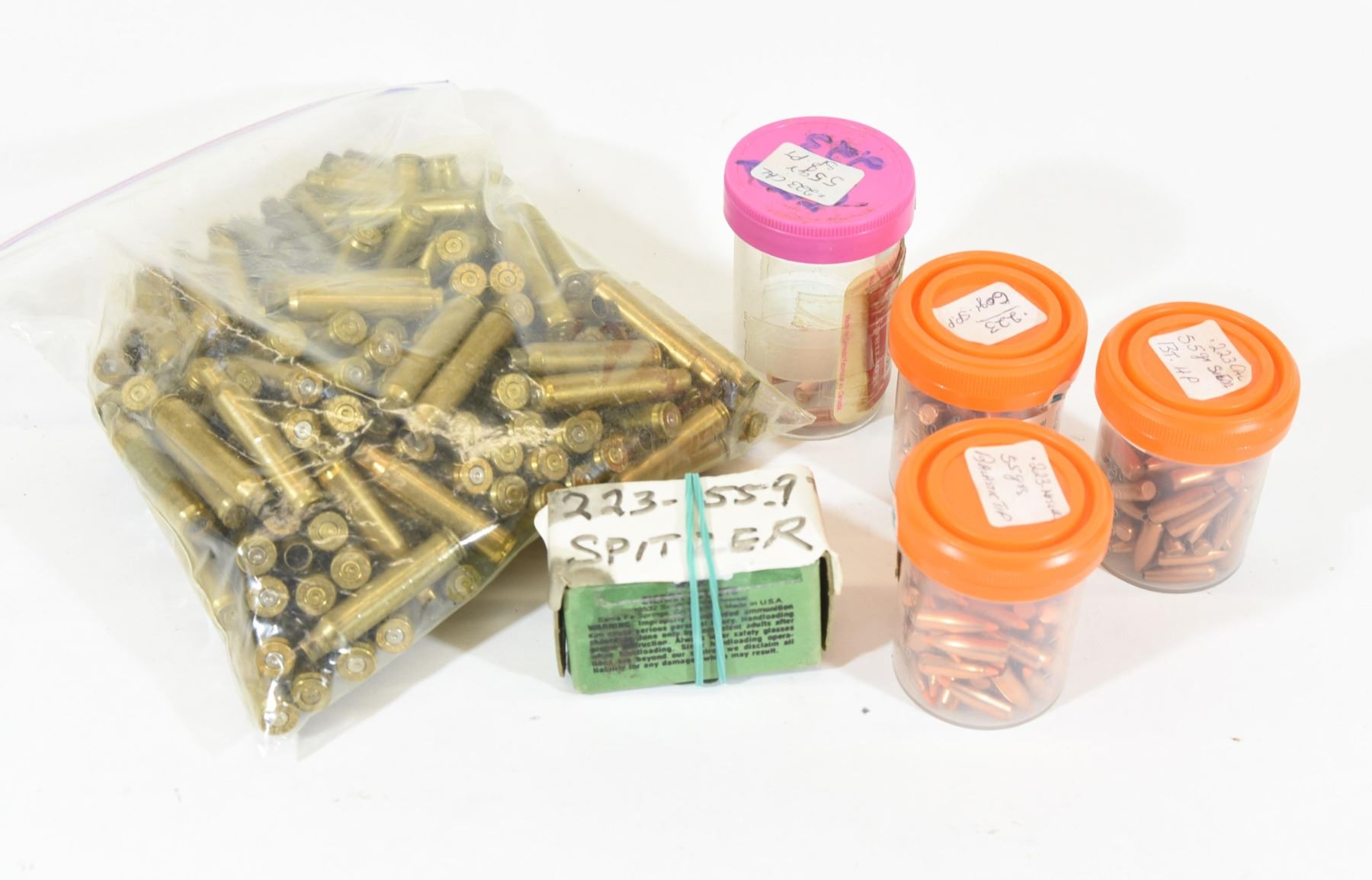 1) 2.25 pounds of fired brass. 2) 2.6 pounds of projectiles.