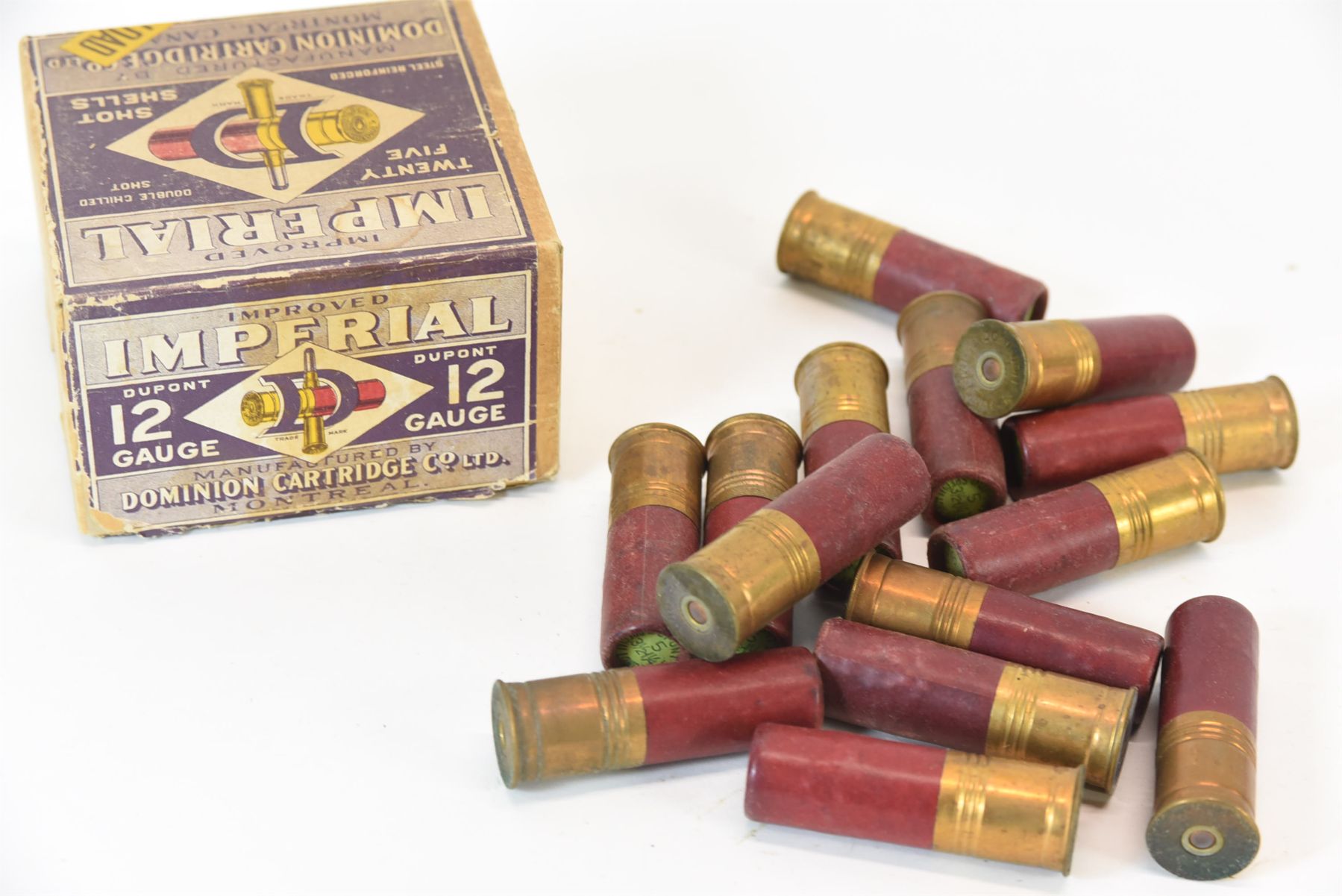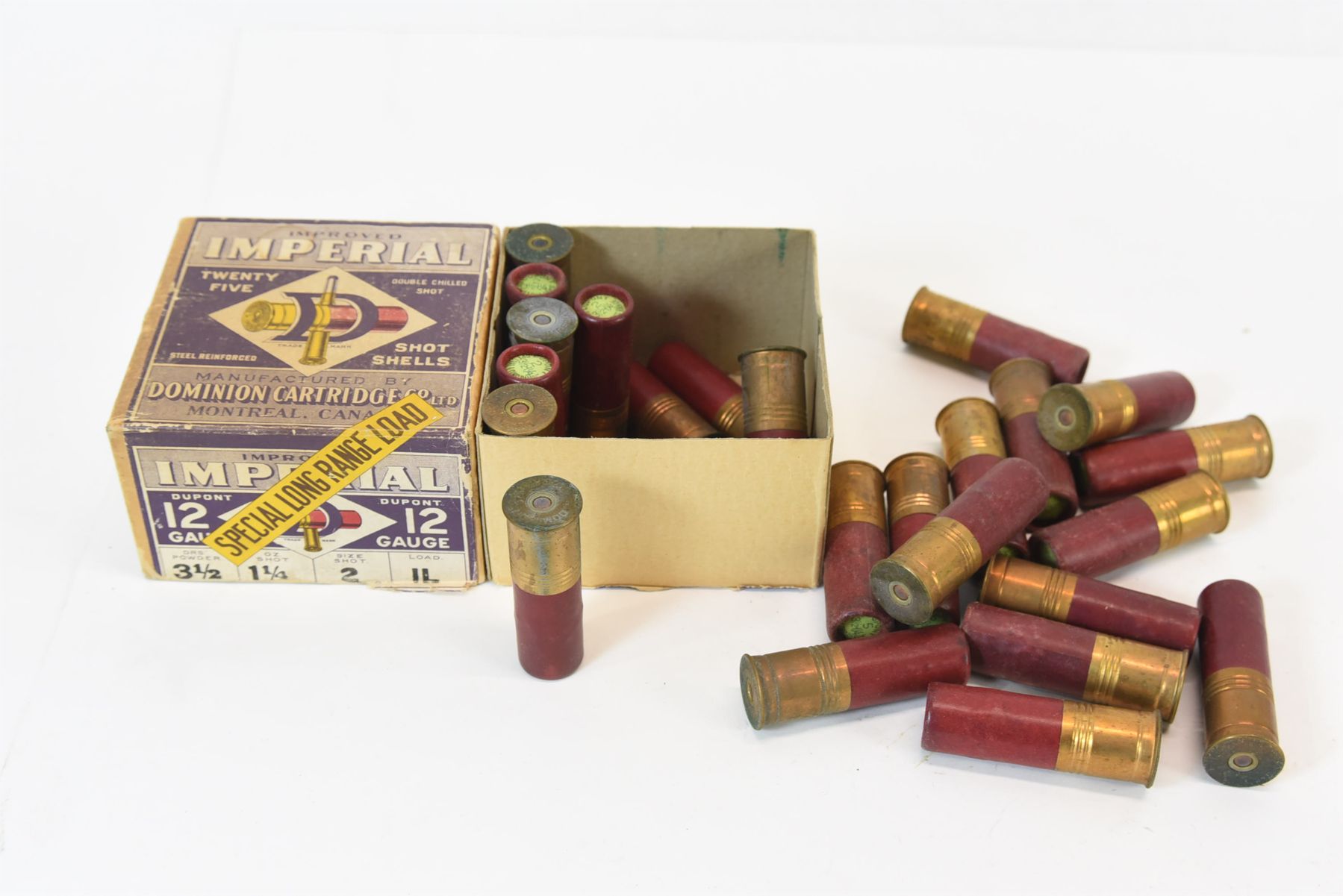 11 rounds Imperial 12 gauge 2-3/4" mixed #2 shot paper shotshell special long range ammunition in original Dominion Cartridge Co. LTD box.