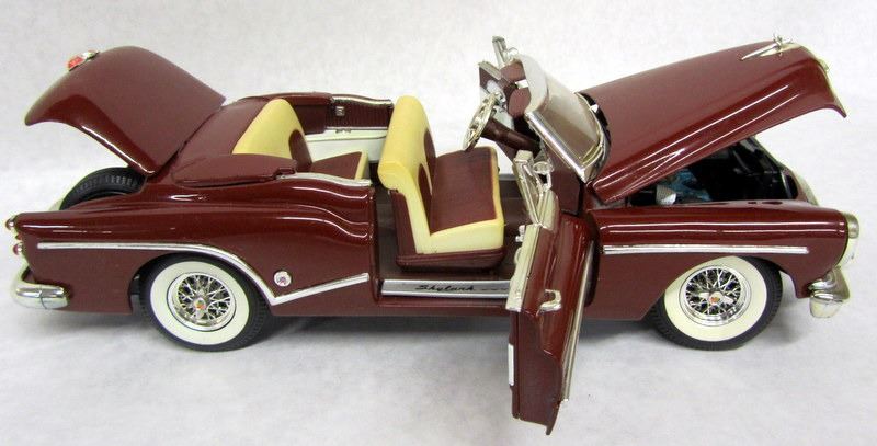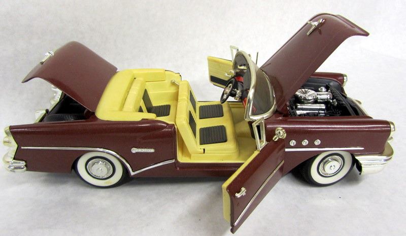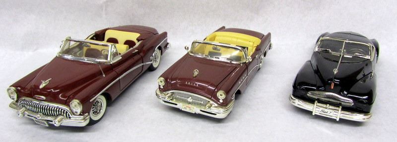 BURGUNDY 1955 BUICK CENTURY, 1:18, MADE BY SOLIDO. BURGUNDY 1953 BUICK SKYLARK, 1:18, MADE BY MOTOR MAX. BLACK 1938 BUICK Y-JOB, 1:18, MADE BY ANSON.