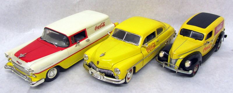 YELLOW 1949 MERCURY, 1:18, MADE BY JOHNNY LIGHTNING. YELLOW 1940 FORD SEDAN DELIVERY, 1:20, MADE BY MATCHBOX. WHITE AND YELLOW 1955 CHEVROLET SEDAN DELIVERY, 1:18, MADE BY JOHNNY LIGHTNING.