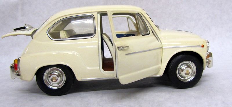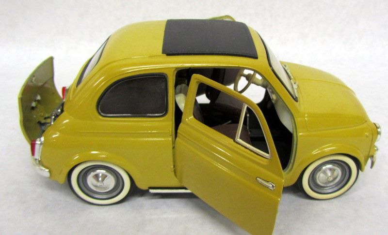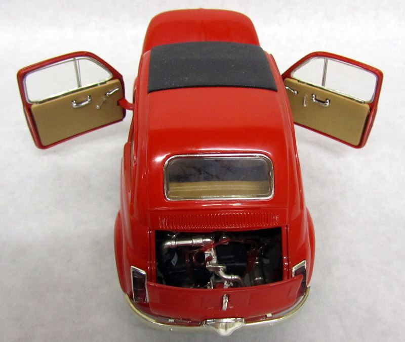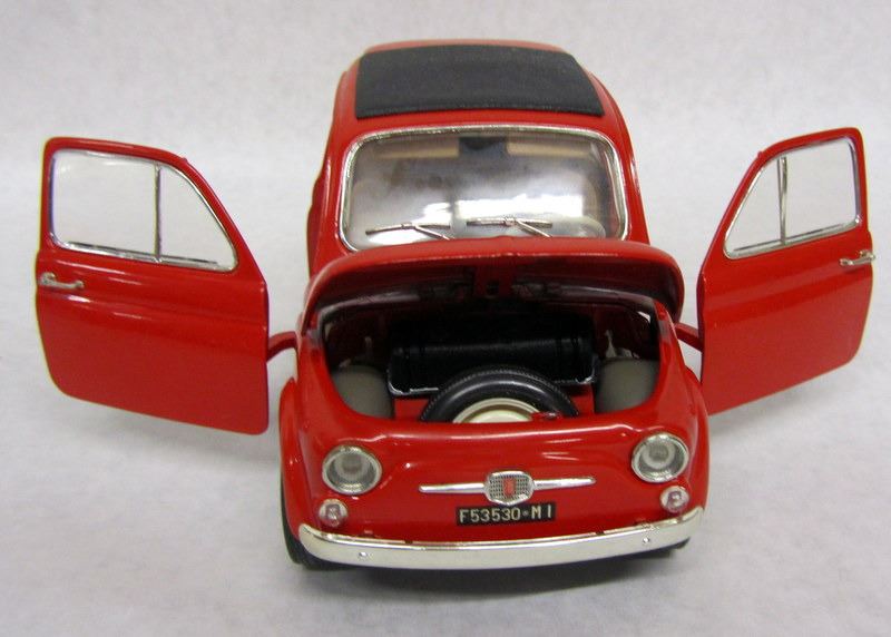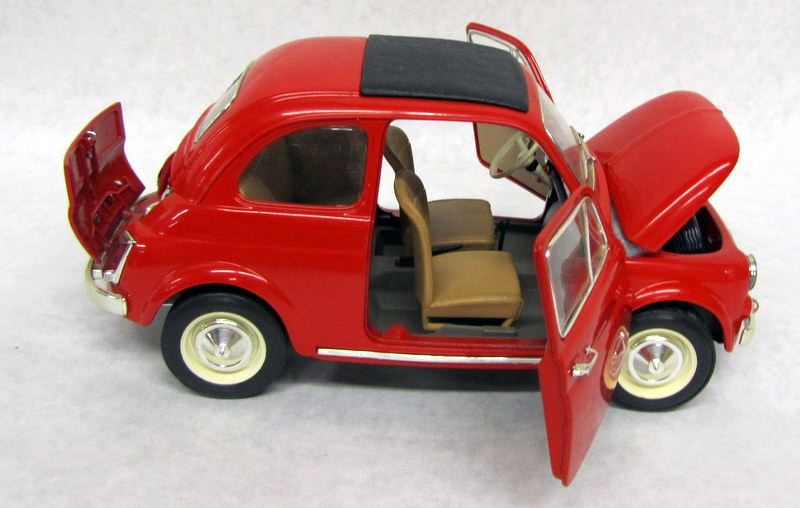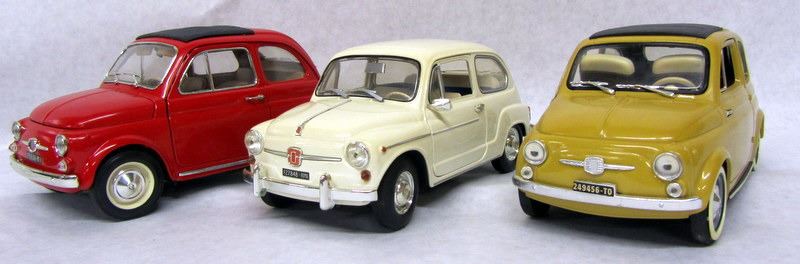 RED FIAT 500, 1:16, MADE BY DURAGO. WHITE FIAT 600, 1:18, MADE BY REVELL. OLIVE FIAT 500, 1:16, MADE BY SOLIDO.