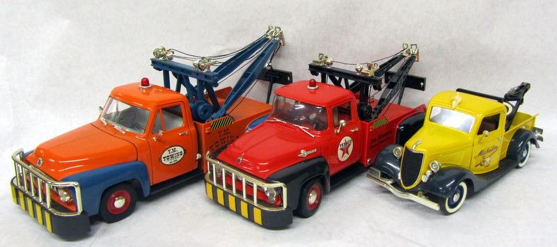 RED TEXACO 1956 FORD F-100 TOW TRUCK, 1:18, MADE BY WELLY. YELLOW MICHELIN 1956 FORD V8, 1:19, MADE BY SOLIBO. ORANGE Y.M. TOWING 1953 FORD F-100 TOW TRUCK, 1:18, MADE BY ROAD SIGNATURE.