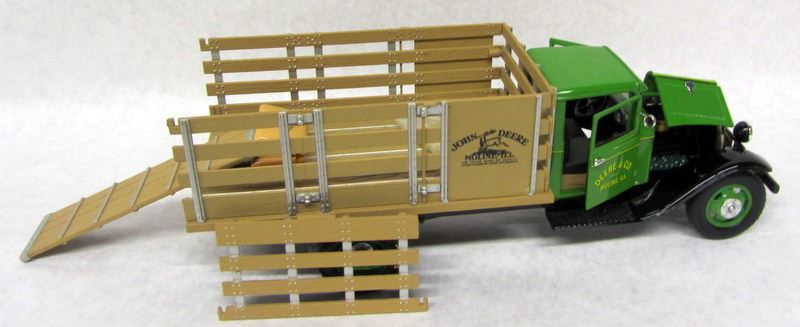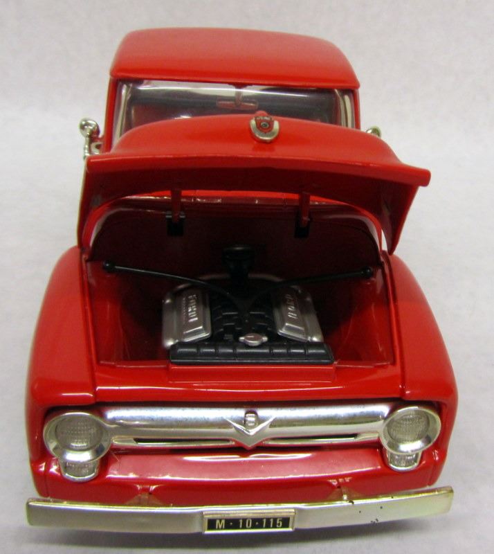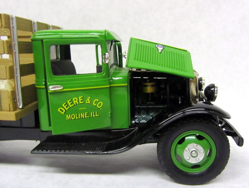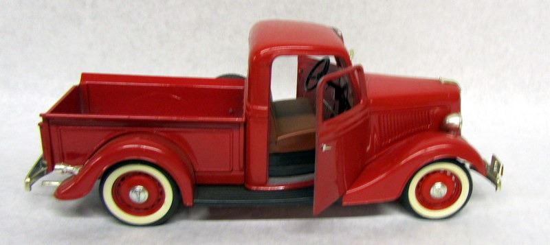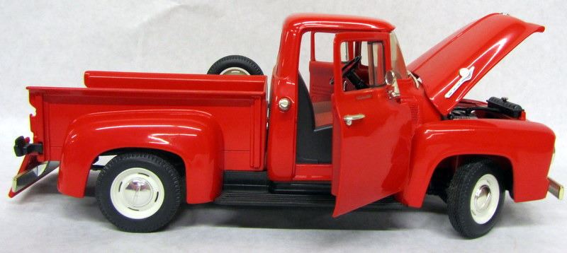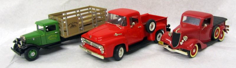 GREEN JOHN DEERE & CO. 1934 FORD BB-157 TRUCK, 1:24, MADE BY CROWN PREMIUMS. RED 1936 FORD V8 PICK UP, 1:19, MADE BY SOLIDO. RED 1956 FORD F-100 PICK UP, 1:18, MADE BY WELLY.