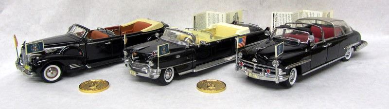 1956 CADILLAC PRESIDENTIAL PARADE CAR, 1:24, MADE BY ROAD SIGNATURE. 1938 CADILLAC V-16 PRESIDENTIAL LIMOUSINE, 1:24, MADE BY ROAD SIGNATURE. 1950 LINCOLN COSMOPOLITAN BUBBLE TOP PARADE VEHICLE, 1:24, MADE BY ROAD SIGNATURE.