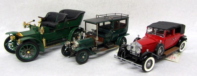 RED 1929 ROLLS-ROYCE PHANTOM I, CABRIOLET DE VILLE, MADE BY FRANKLIN MINT. GREEN 1907 ROLLS-ROYCE SILVER GHOST, MADE BY FRANKLIN MINT. GREEN 1905 ROLLS-ROYCE, MADE BY FRANKLIN MINT.