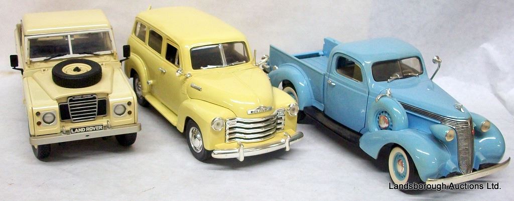 1937 STUDEBAKER COUPE EXPRESS PICKUP BY SIGNATURE, 1950 CHEVY CARRYALL SUBURBAN BY MIRA, LAND ROVER BY UNIVERSAL HOBBIES.