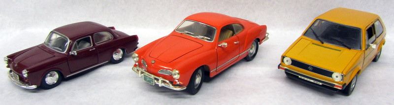 YELLOW VW GOLF, 1:18, MADE BY VITESSE. ORANGE 1966 VW KARMANN-GHIA, 1:18, MADE BY ROAD SIGNATURE. RED VW 1600, 1:24, MADE BY MAISTO.