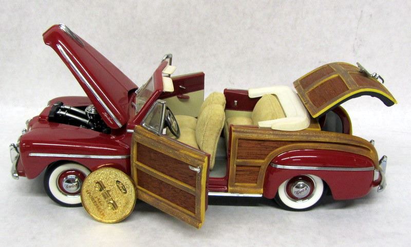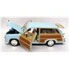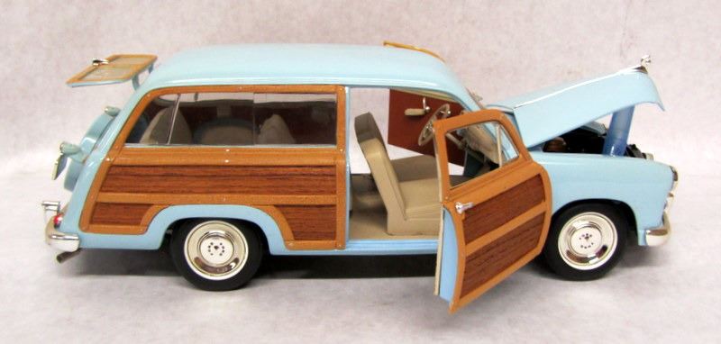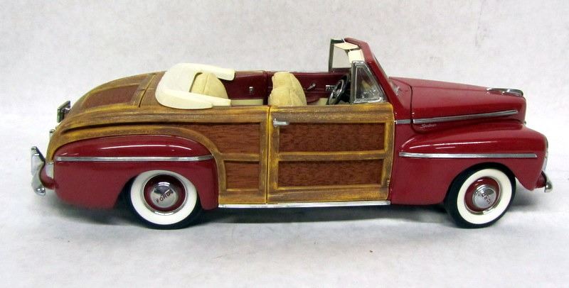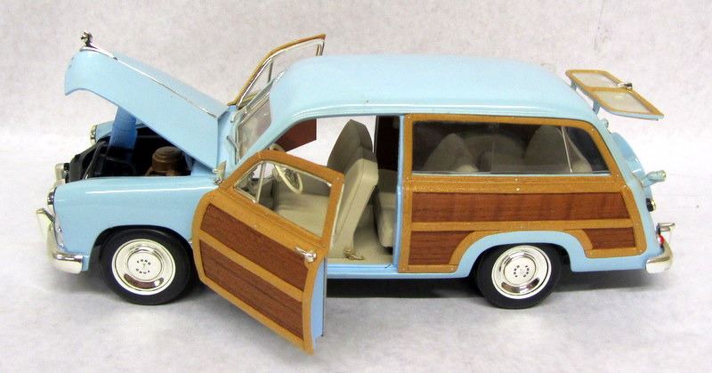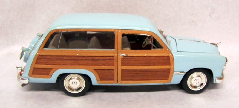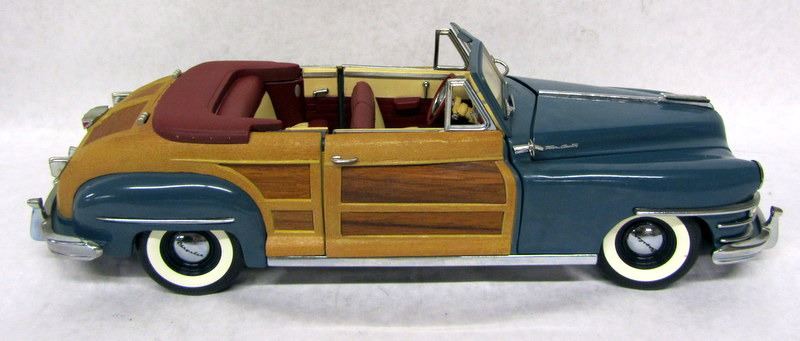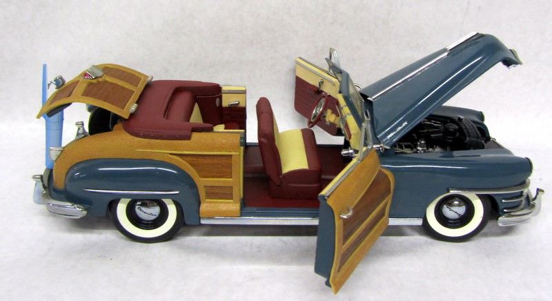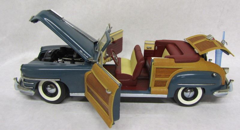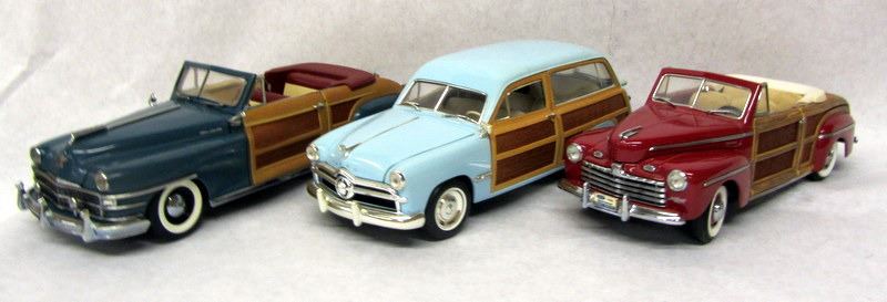 BLUE 1948 CHRYSLER TOWN AND COUNTRY, 1:18, MADE BY MOTOR CITY CLASSICS. RED 1946 FORD SPORTSMAN, 1:18, MADE BY ROAD SIGNATURE. BLUE 1949 FORD WOODY WAGON, 1:18, MADE BY MOTOR CITY CLASSICS.
