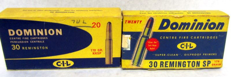 VINTAGE DOMINION BOXES. 170 GR. SOFT POINTS. PLUS 6 PIECES FIRED BRASS.