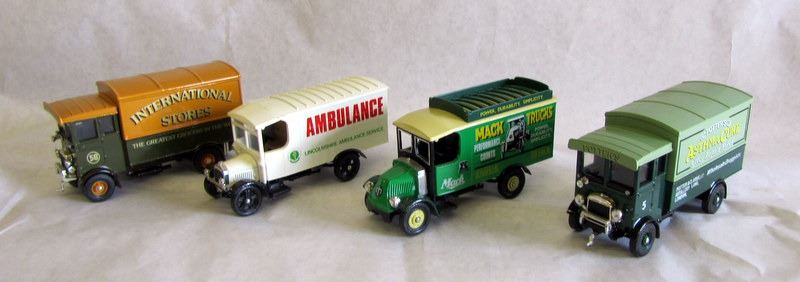 MACK BRANDED TRUCK, MADE BY CORGI. POTTER & CLARKE BRANDED TRUCK, MADE BY CORGI. LINCONSHIRE AMBULANCE, MADE BY CORGI. INTERNATIONAL STORES GROCERY TRUCK, MADE BY CORGI.