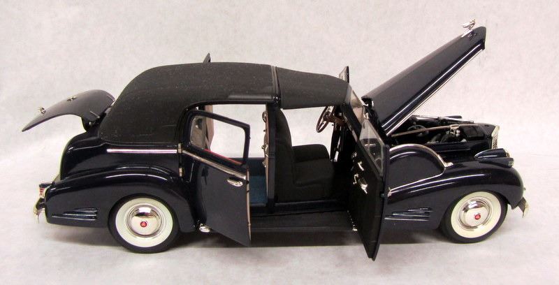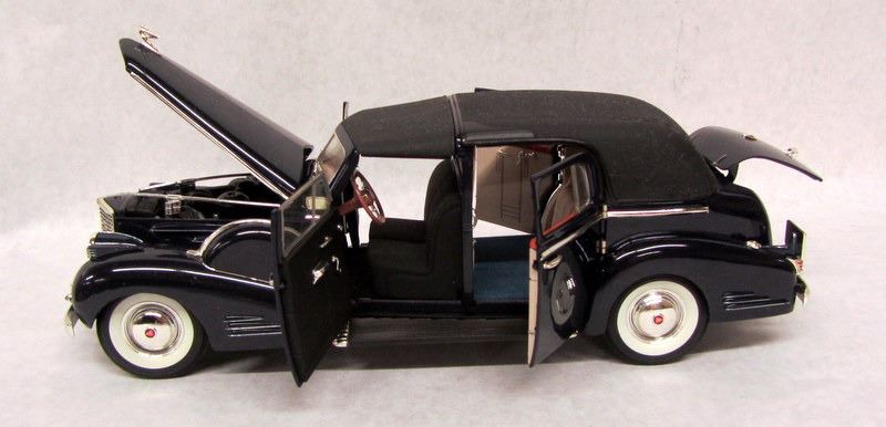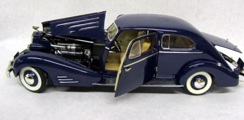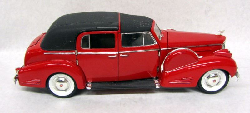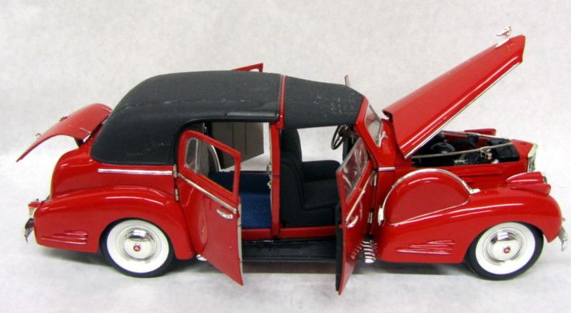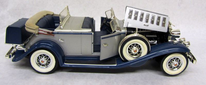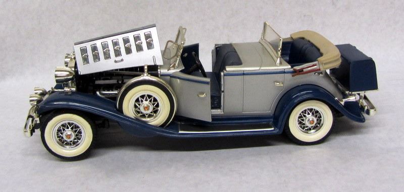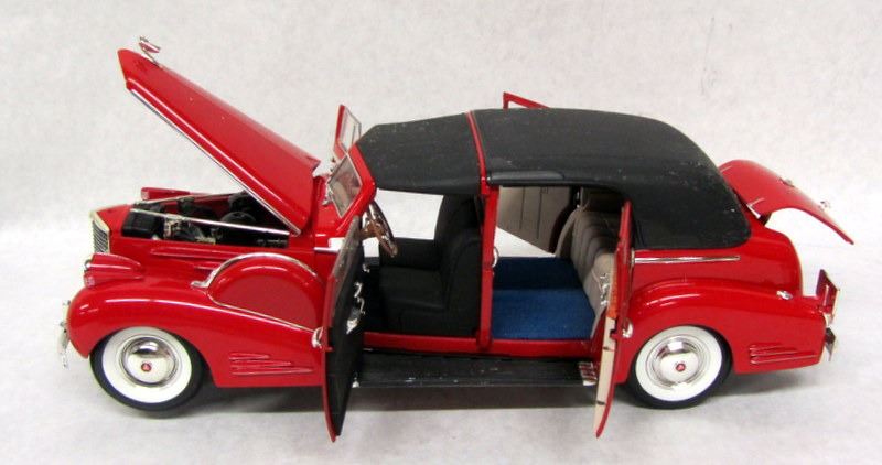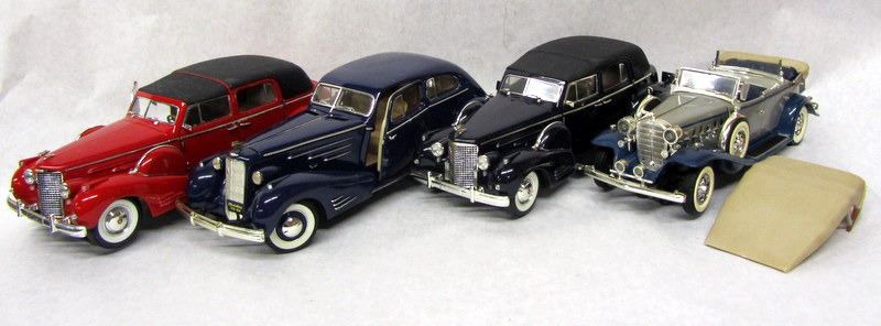 SILVER 1932 CADILLAC PHAETON V16, 1:18, MADE BY ANSON. RED 1938 CADILLAC, 1:18, MADE BY SIGNATURE. BLUE 1938 CADILLAC, 1:18, MADE BY SIGNATURE. BLUE 1934 CADILLAC V-16 AEROCOOUPE. 1:18, MADE BY RICKO