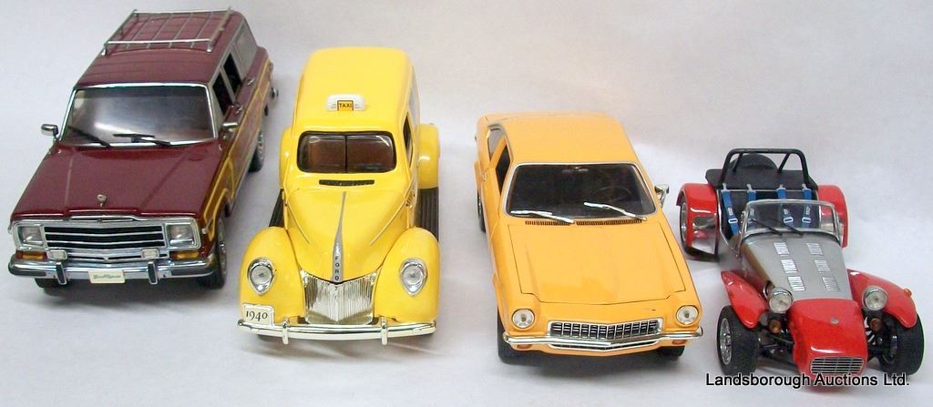 RED CATERHAM SUPER SEVEN 1:18 SCALE BY KYOSHO, 1972 CHEVY VEGA BY ERTL 871 OF 5000, YELLOW FORD TAXI, JEEP GRAND WAGONEER 1:18 SCALE BY AUTO ART.