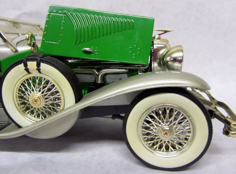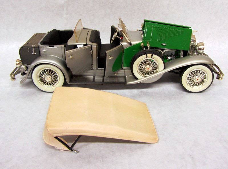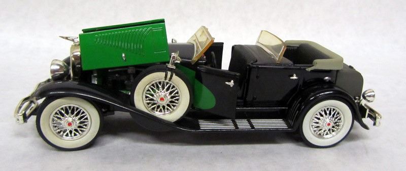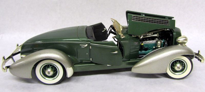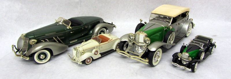 GREEN 1935 AUBURN BOATTAIL SPEEDSTER, 1:18, MADE BY ERTL. WHITE 1935 AUBURN 851, MADE BY SIGNATURE. GREEN AND BLACK 1934 DUESENBERG, MADE BY SIGNATURE. GREEN AND SILVER 1934 DUESENBERG, 1:18, MADE BY SIGNATURE.