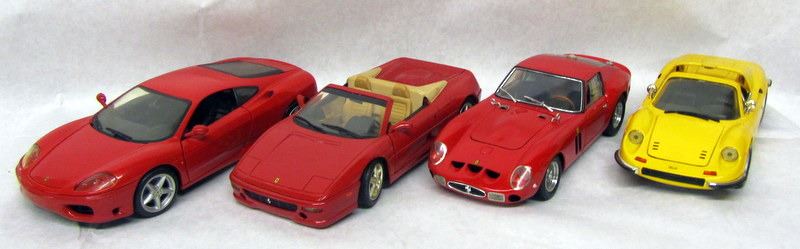 RED FERRARI 360 MODENA, 1:18, MADE BY HOTWHEELS MATTEL. RED FERRARI F335, 1:18, MADE BY HOTWHEELS MATTEL. RED FERRARI 250 GTO, 1:18, MADE BY HOTWHEELS MATTEL. YELLOW FERRARI DINO 246 CTS, 1:18, MADE BY HOTWHEELS MATTEL..