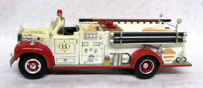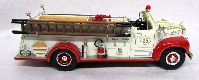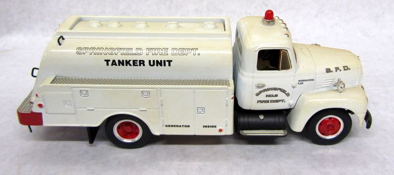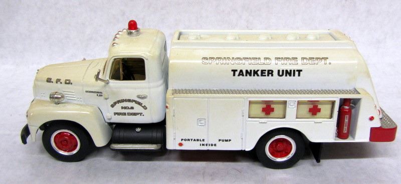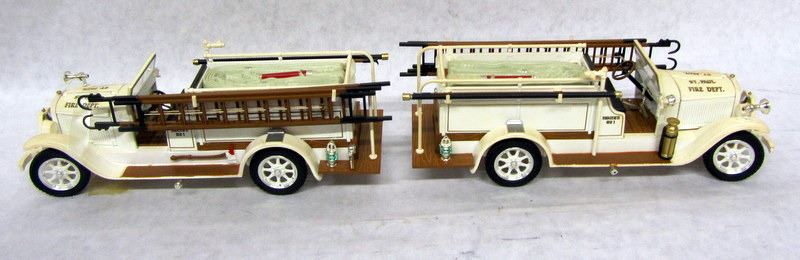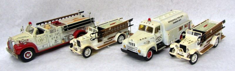 TWO IDENTICAL ST. PAUL FIRE DEPT. 1928 REO FIRETRUCKS, MADE BY SIGNATURE. PRINGFIELD FIRE DEPT. 1957 INTERNATIONAL TANKER, MADE BY FIRST GEAR. BALTIMORE FIRE DEPT MACK TRUCK, MADE BY FIRST GEAR INC.