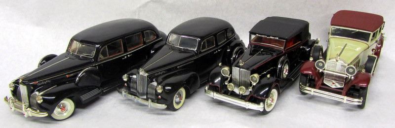 BLACK 1934 PACKARD, 1:18, MADE BY ANSON, REAR BUMPER PROKEN. BLACK 1941 PACKARD LEBARON, 1:18, MADE BY SIGNATURE. BLACK 1938 PACKARD LEBARON, 1:18, MADE BY SIGNATURE. BEIGE AND BURGUNDY PACKARD, 1:18, MADE BY SIGNATURE.