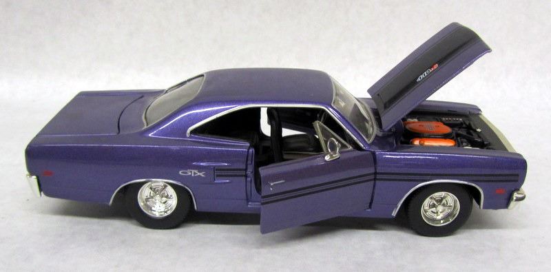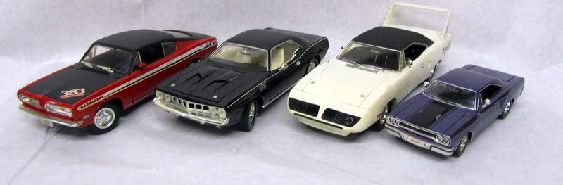 BLACK 1971 PLYMOUTH BARRACUDA, 1:18, MADE BY ERTL. RED 1969 PLYMOUTH BARRACUDA, 1:18, MADE BY ROAD SIGNATURE. PURPLE 1970 PLYMOUTH GTX, 1:25, MADE BY MAISTO. 1970 PLYMOUTH SUPERBIRD, 1:18, MADE BY ERTL, MISSING ANTENNA.