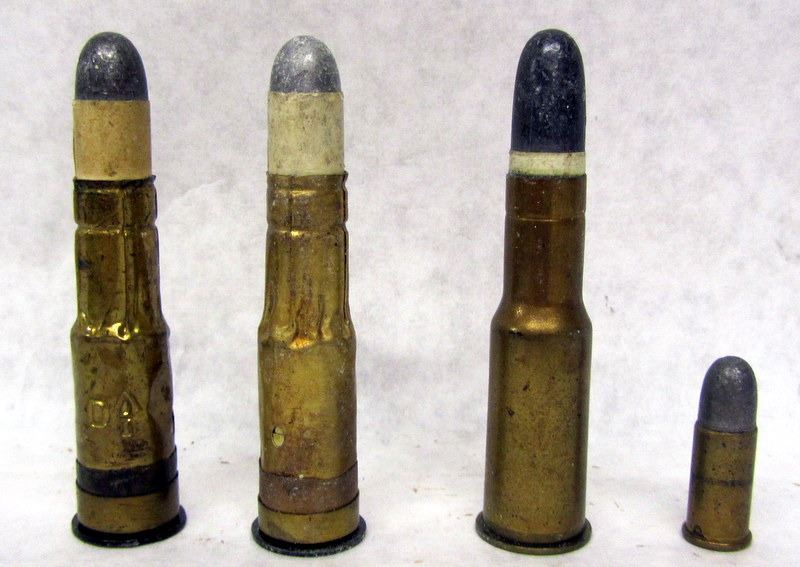 3 RDS 577-450. 2 ARE ROLLED BRASS FOIL, 1 IS MARKED WITH A "D" AND ARROW. 1 RND BLACK POWDER 38 S&W.