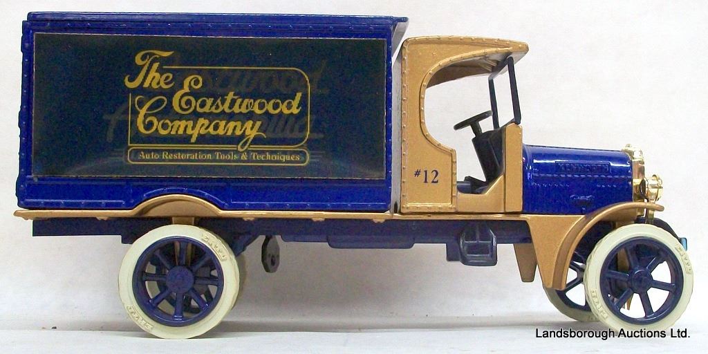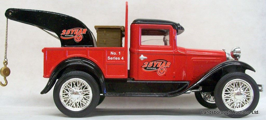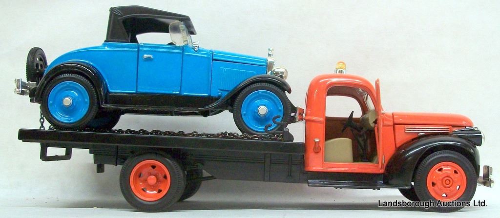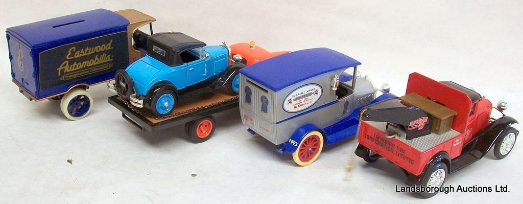 CANADIAN TIRE MODEL A TOW TRUCK NO 1 SERIES 4, AJAX 1941 CHEVY FLATBED WITH 1928 CHEVY ROADSTER, 1916 STUDEBAKER, BLUE AND GOLD KENWORTH.