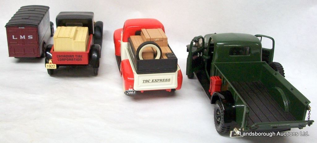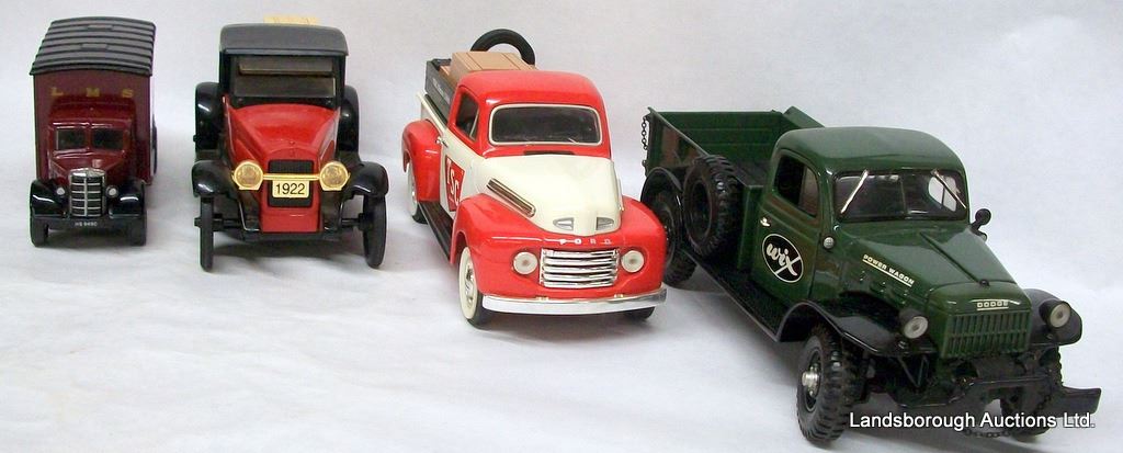 DODGE POWER WAGON BY EAST COLLECTIBLES, 1948 RED TSC STORES FORD BY LIBERTY CLASSICS, 1922 RED CTC STUDEBAKER BY LIBERTY CLASSICS, BEDFORD O SERIES VAN LMS EXPRESS BY CORGI.