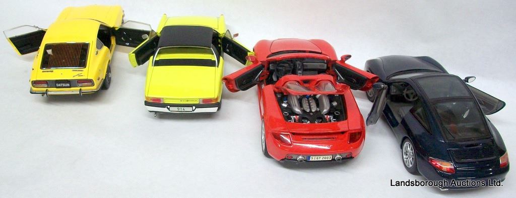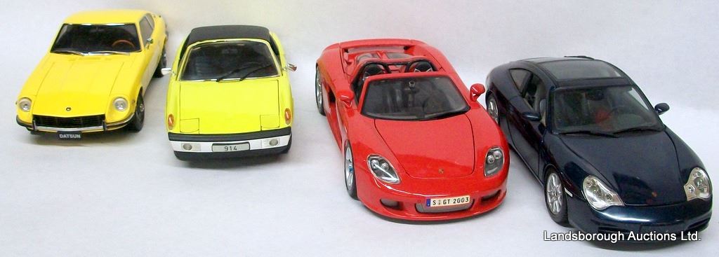 PORSCHE 911 TARGA 1:18 SCALE BY MAISTO, RED PORSCHE CARRERA GT 1:18 SCALE BY MAISTO, PORSCHE 914BY REVELL, DATSUN 240Z 1:18 SCALE BY KYOSHO.