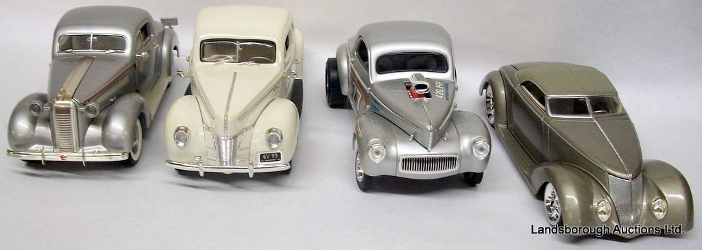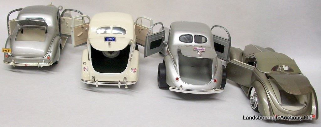 SILVER 1936 FORD BY FOOSE DESIGN, SILVER 1941 WILLYS 1:18 SCALE BY SIGNATURE, WHITE 1940 FORD DELUXE 1:18 SCALE, SILVER 1936 PONTIAC DELUXE 1:18 SCALE BY SIGNATURE.