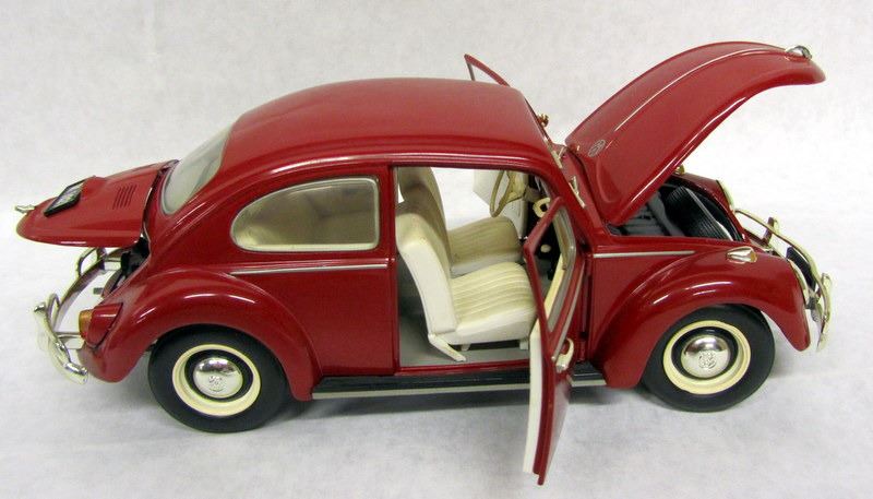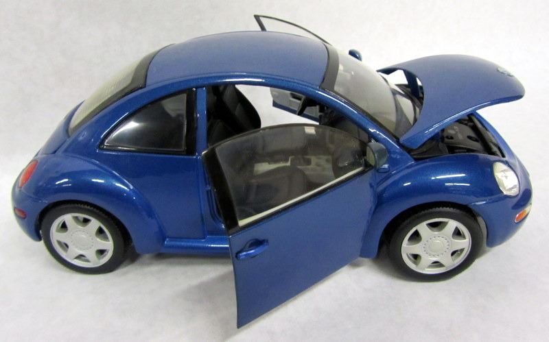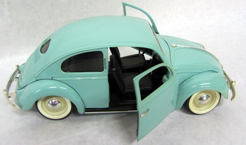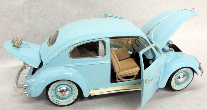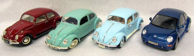 BLUE VW NEW BEETLE, 1:18, MADE BY MAISTO. SKY BLUE 1955 VW BEETLE, 1:18, MADE BY BURAGO. TEAL VW COCCINELLE, 1:17, MADE BY SOLIBO. RED VW BEETLE, MADE BY PLAYING MANTIS.