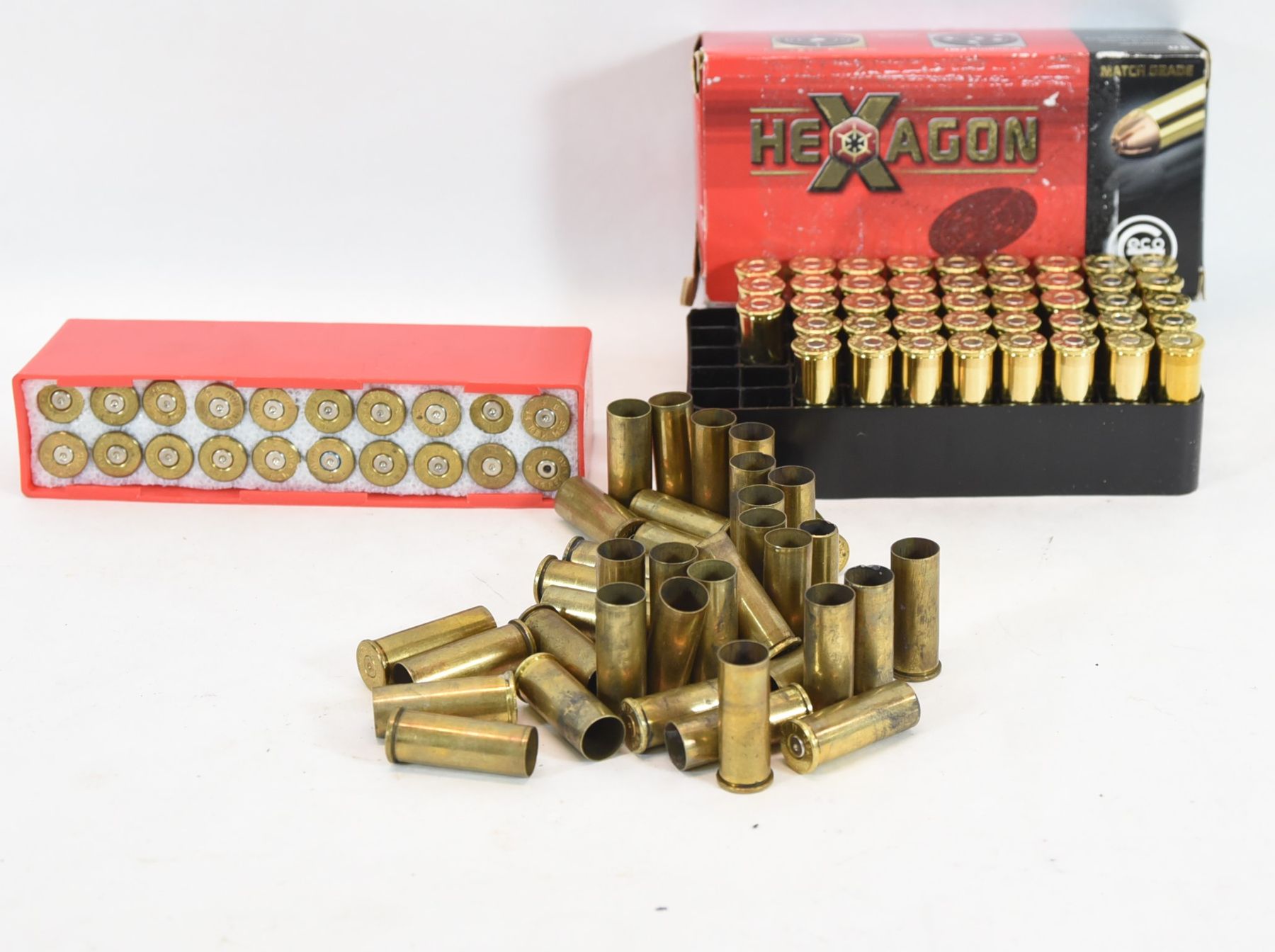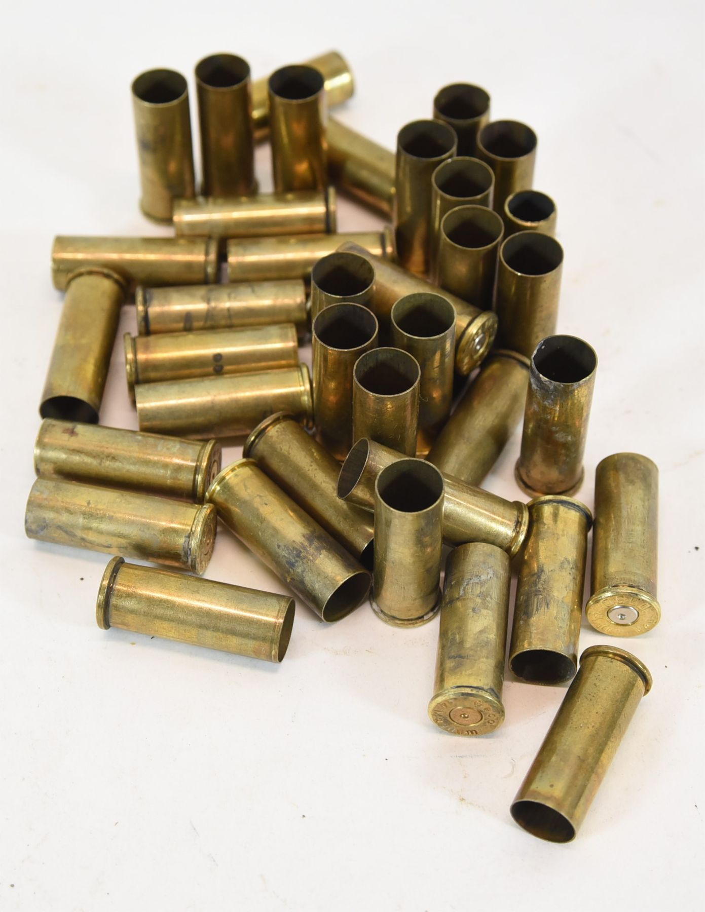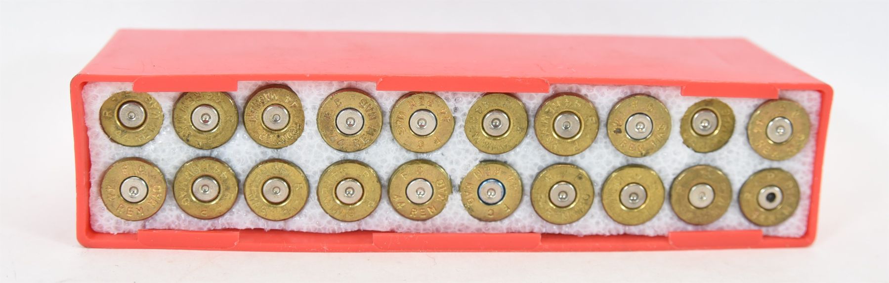 58 fired brass in bag with plastic case 44 Mag. 19 RP, 8 FC, 1 Frontier, 16 Geco and 14 WW.