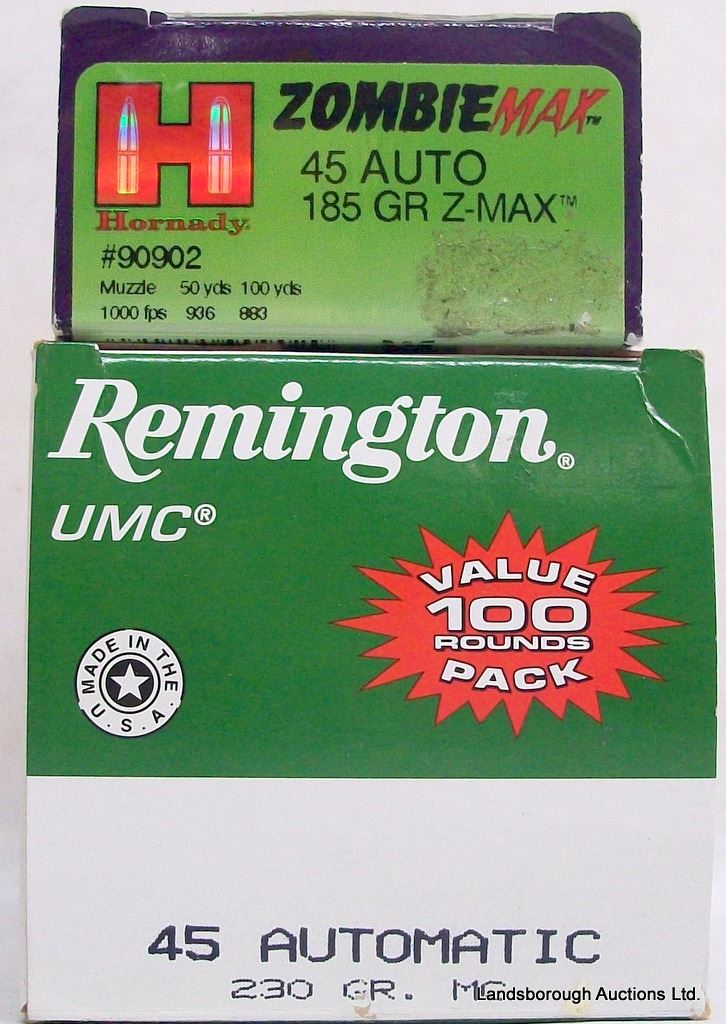20 RNDS HORNADY ZOMBIE MAX 185 GRN, 100 RNDS REMINGTON 230 GRN.
