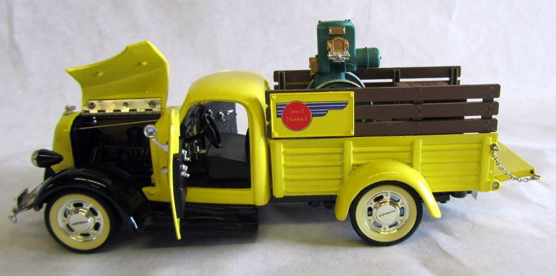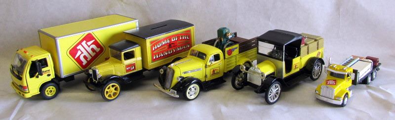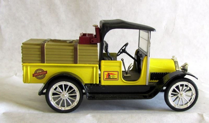 YELLOW 1916 STUDEBAKER, MADE BY LIBERTY CLASSICS. YELLOW 1938 STUDEBAKER, MADE BY LIBERTY CLASSICS. YELLOW 1931 HAWKEYE, MADE BY ERTL. YELLOW GMC TRUCK, MADE BY ERTL. YELLOW PETERBILT FLATBED.