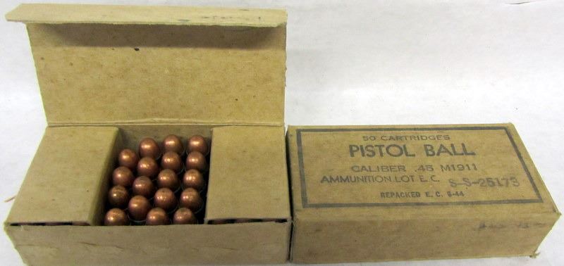 TWO BOXES, ONE UNOPENED, VINTAGE 45 ACP AMMO. 1943 HEADSTAMP.
