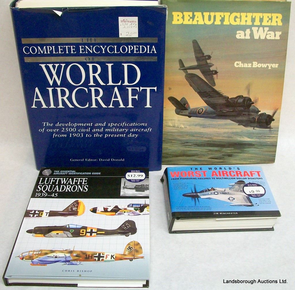 WORLD AIRCRAFT ENCYCLOPEDIA, LUFTWAFFE SQUADRONS, WEAPONS OF WAR 3 BOOK SERIES, THE AVRO ARROW 2, BEAUFIGHTER AT WAR, ALLIED FIGHTERS 2, WORLDS WORST AIRCRAFT. WEIGHS 10.5KG.