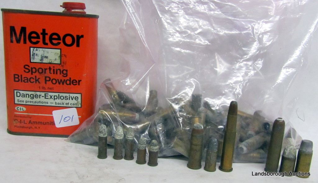127 RNDS MIXED VINTAGE RIFLE AND PISTOL AMMUNITION (EXAMPLES 32 RF SHORT, 32 RF LONG, 45 COLT, 32 LONG CF, 45 WEBLEY, 44-40, 32 SPL, 401 SL) AND 1LB METEOR FFFG BLACK POWDER. WILL NOT SHIP, MUST PICKUP.