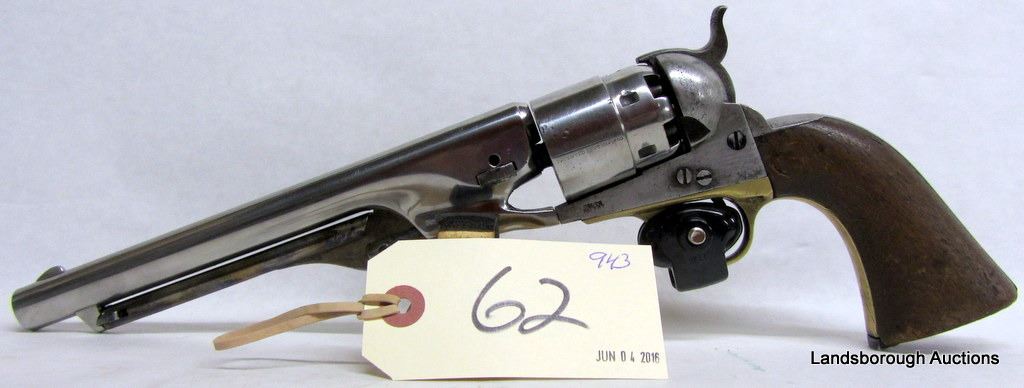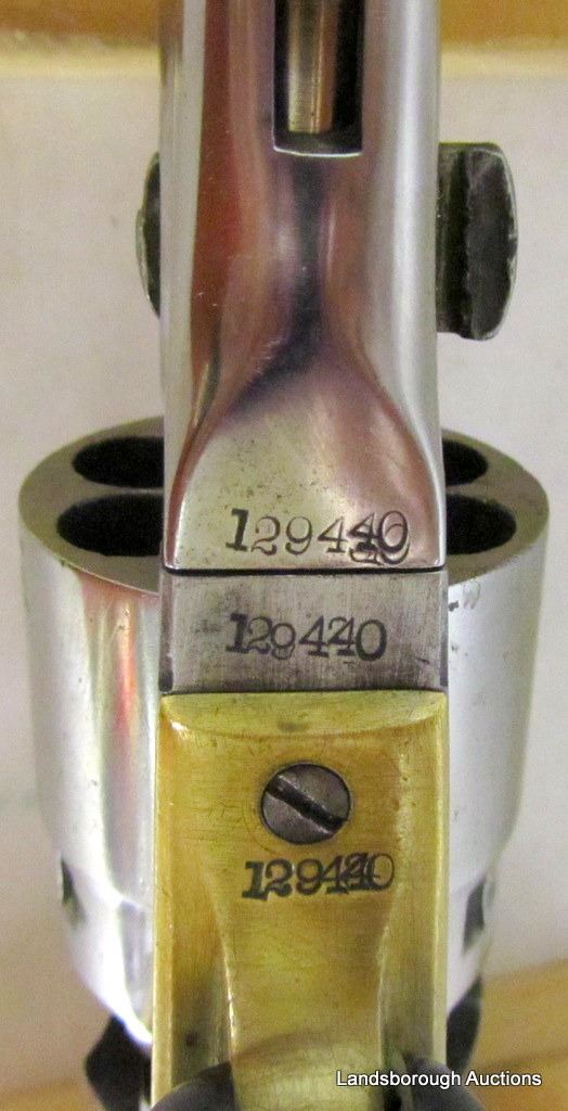 ANTIQUE, REVOLVER, 44 PERCUSSION, 204MM BARREL, SN 129440. WOOD GRIPS OVERSANDED, LETTER D SCRIBED IN RIGHT GRIP, BARREL AND CYLINDER NICKEL PLATED WITH MARKS VISIBLE, FRAME BLUING IS COMPLETELY GONE WITH LIGHT PITTING, BORE HAS SOME PITTING AND RIFLING IS PROMINENT.