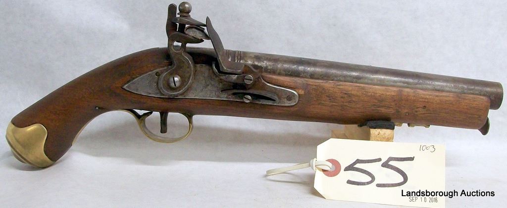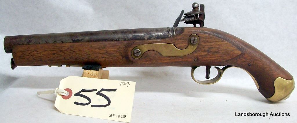 ANTIQUE, SINGLE SHOT, 65 FLINTLOCK, 215MM BARREL, SN NONE. WOOD HAS A CHIP AND SOME MARKS, BLUING TURNING BROWN, BORE PITTED.