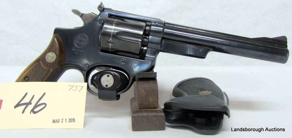 RESTRICTED, REVOLVER, 357 MAGNUM, 152MM BARREL, SN 150265. WOOD GRIPS HAVE A FEW MARKS, BLUING WORN AT MUZZLE AND CYLINDER FACE, BORE GOOD. COMES WITH RUBBER PACHMAYR GRIPS.