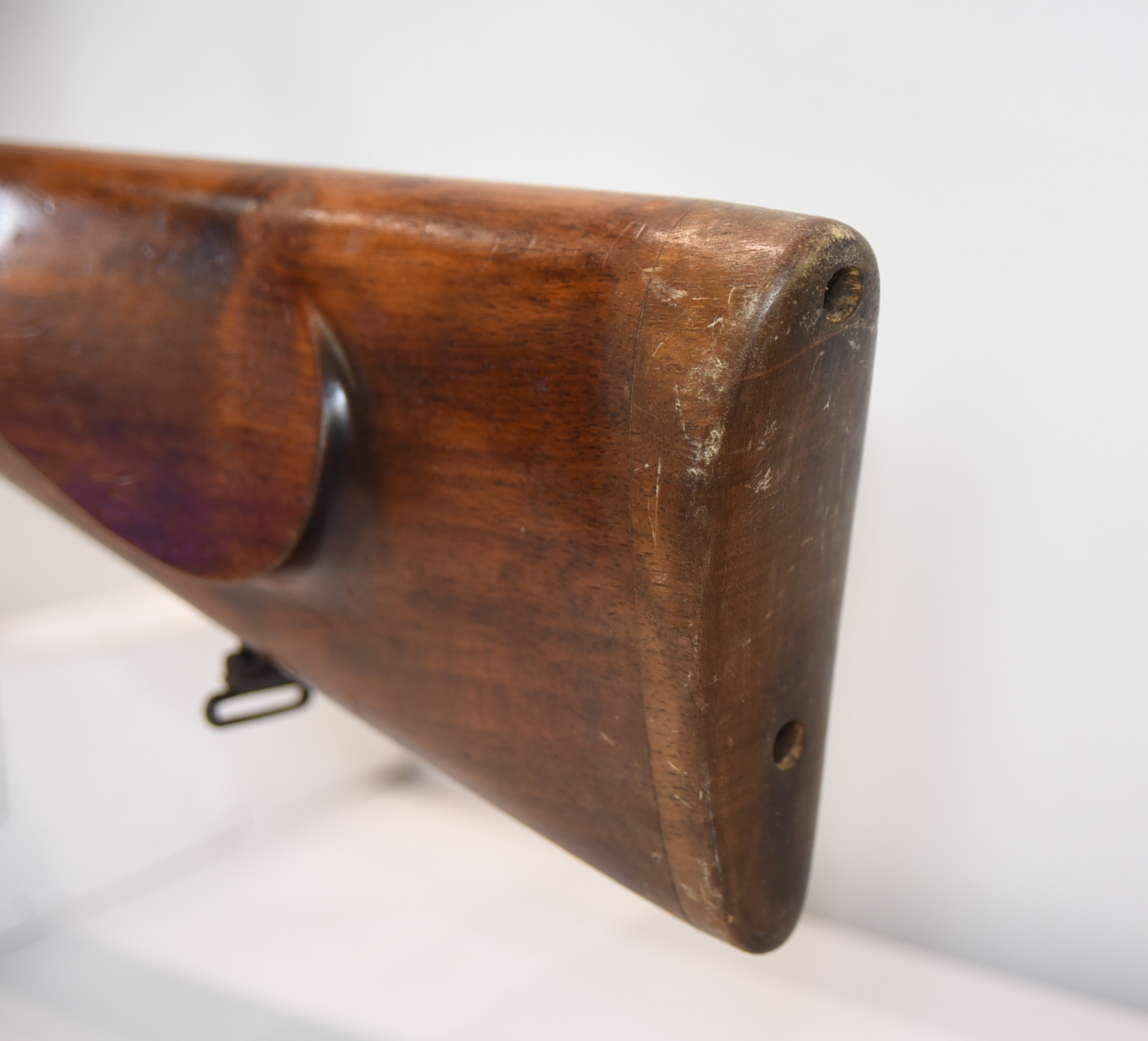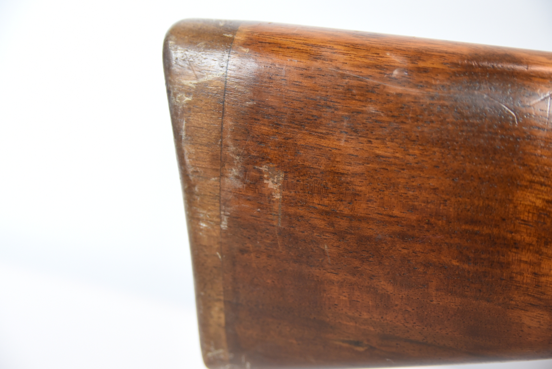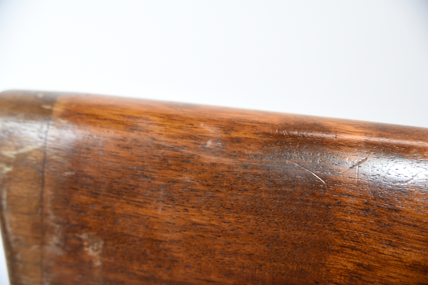 Wood stock shows front forearm is missing, there are scratches & scuffs, light dents, butt plate is wood, finish wear in areas; condition is fair.