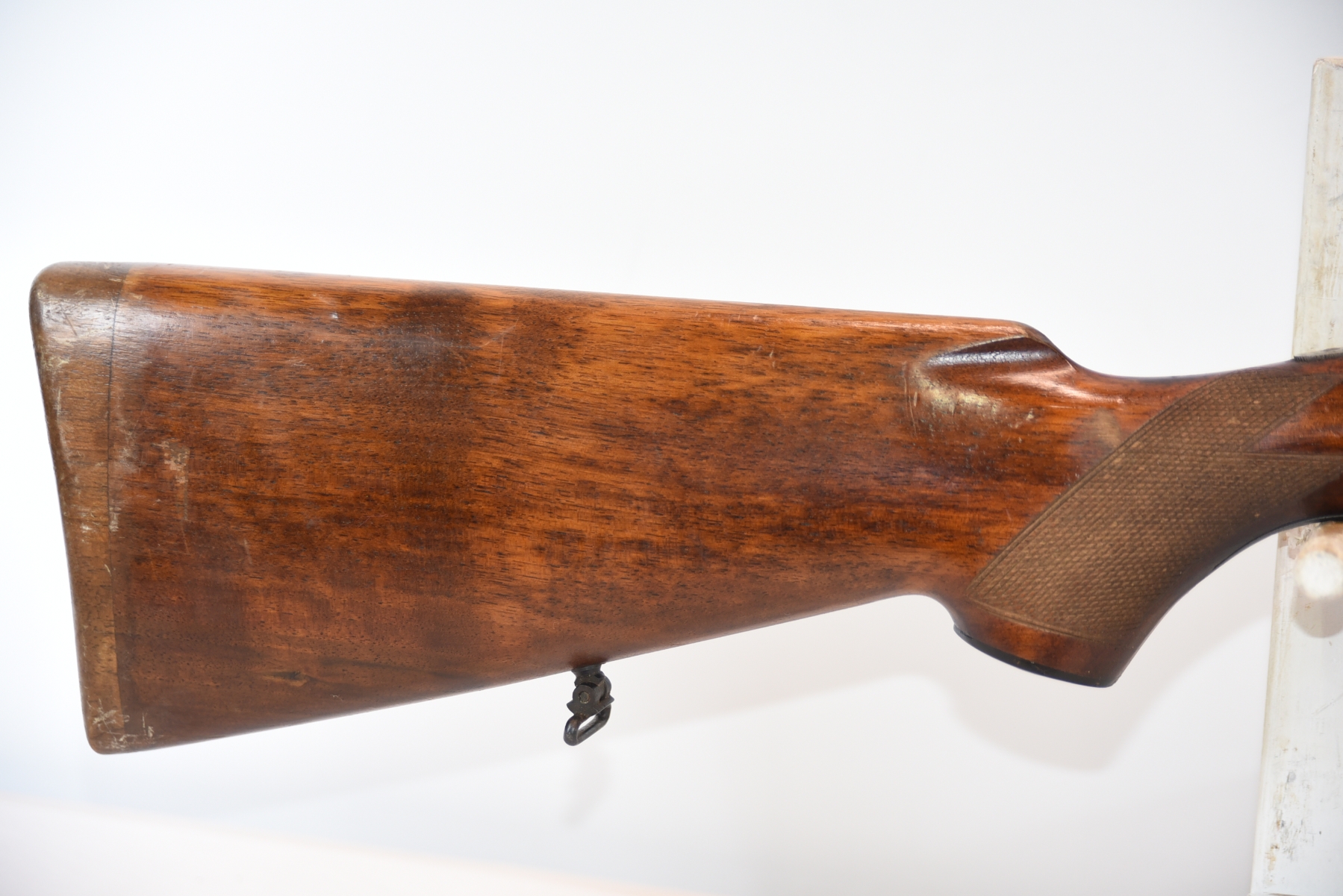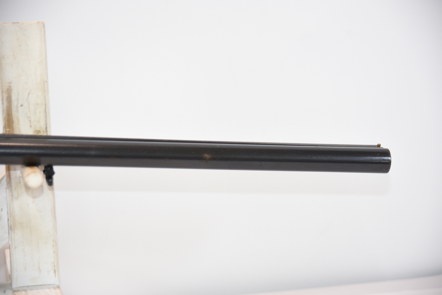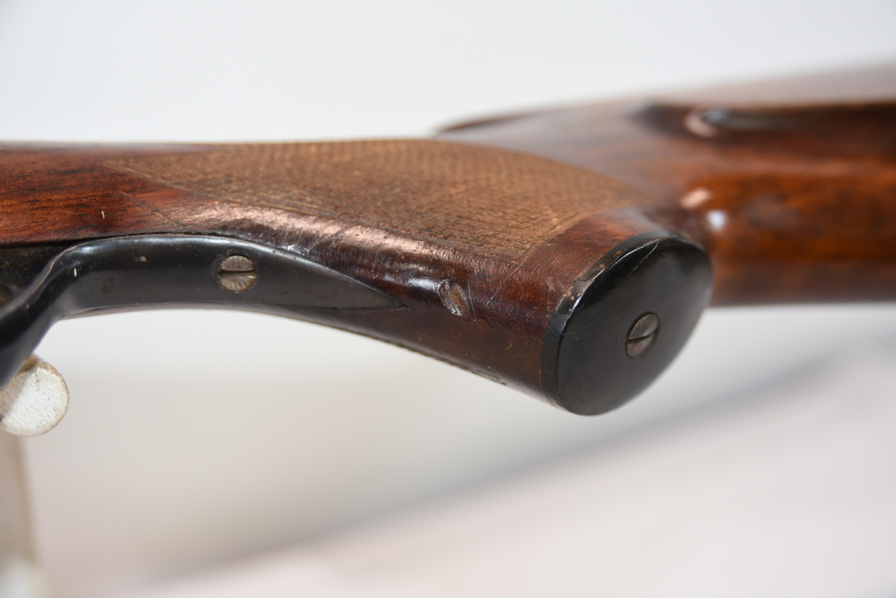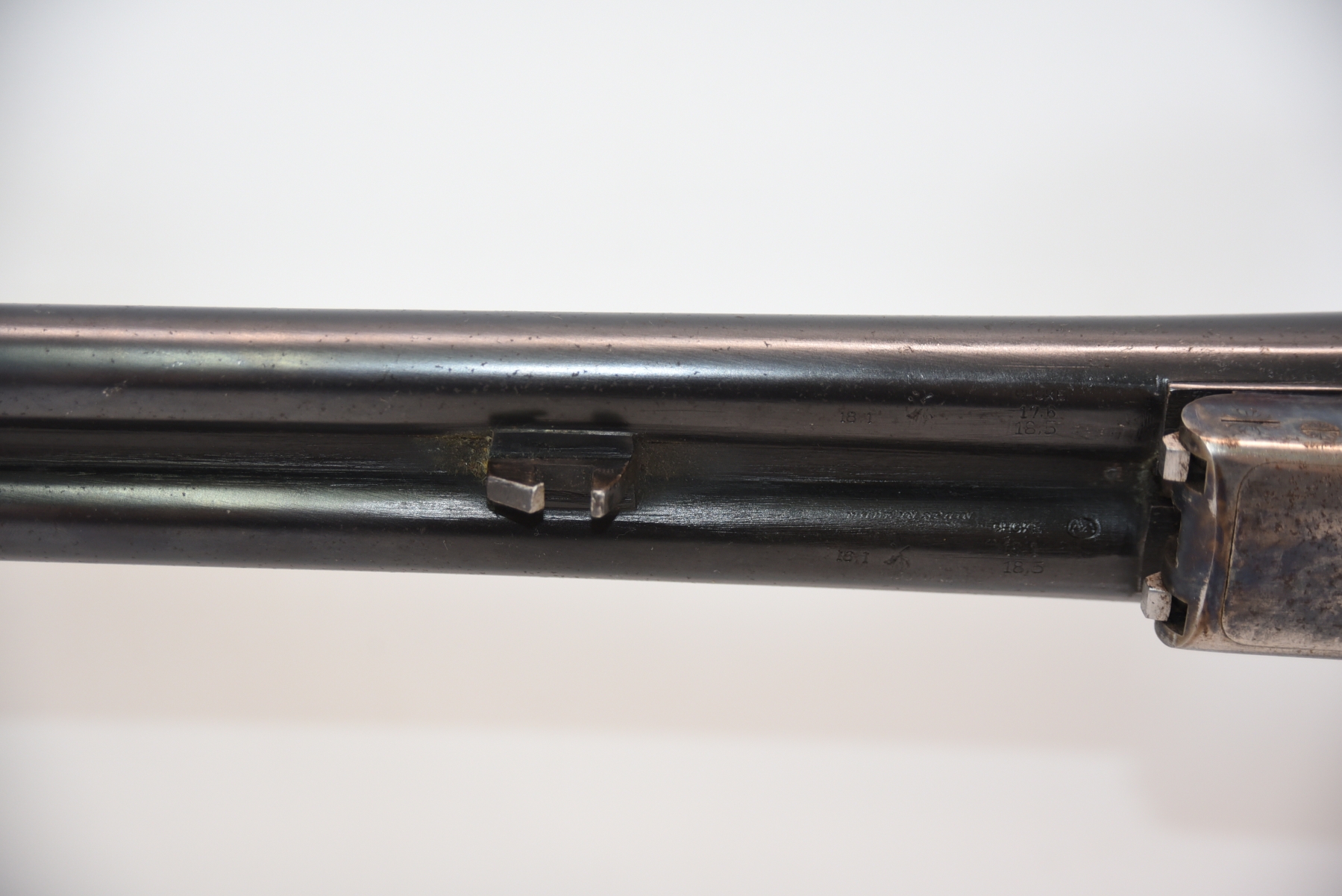 Wood stock shows front forearm is missing, there are scratches & scuffs, light dents, butt plate is wood, finish wear in areas; condition is fair.