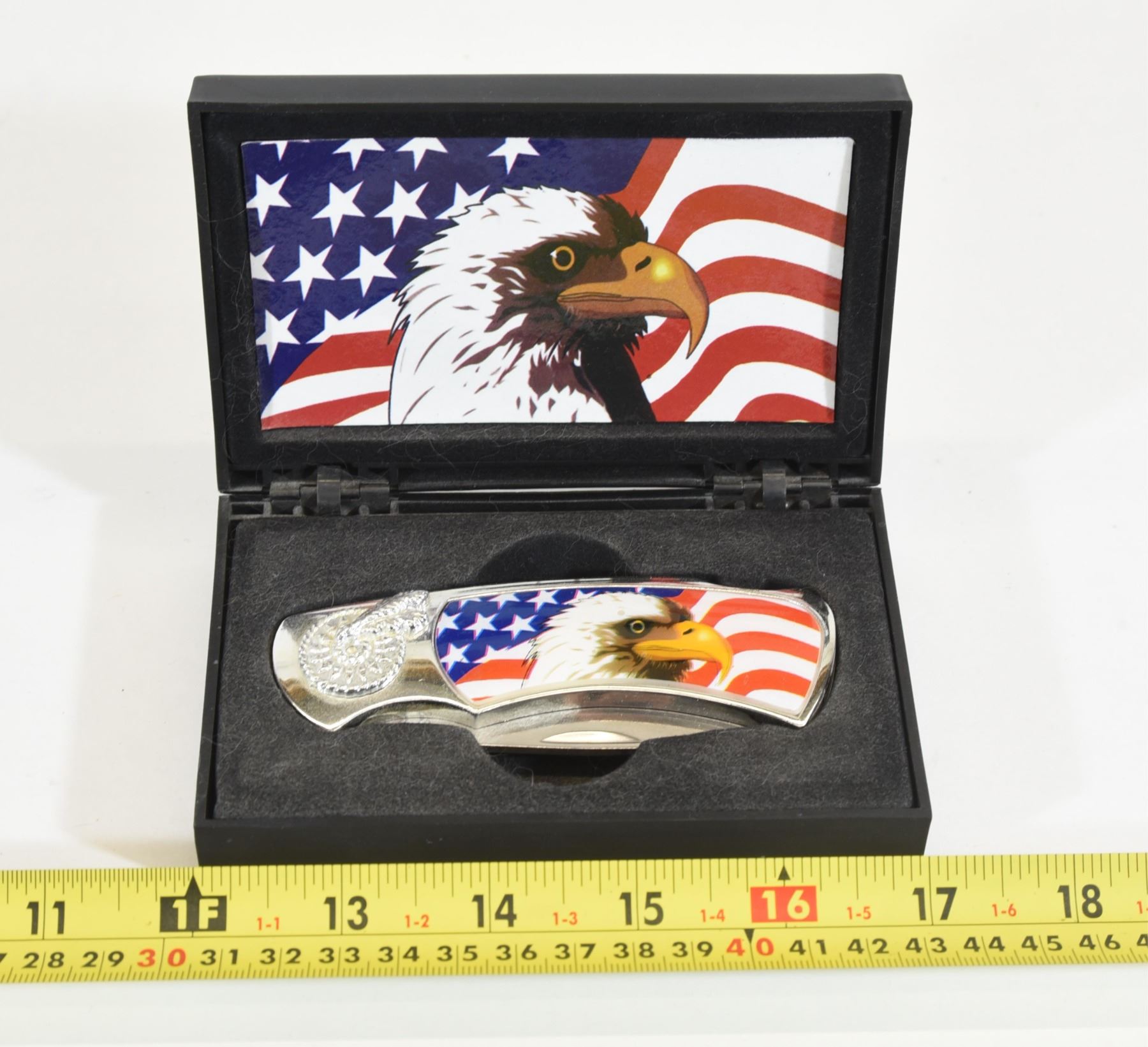 American bald eagle knife. 3" blade. 7" in overall length. Comes with box.