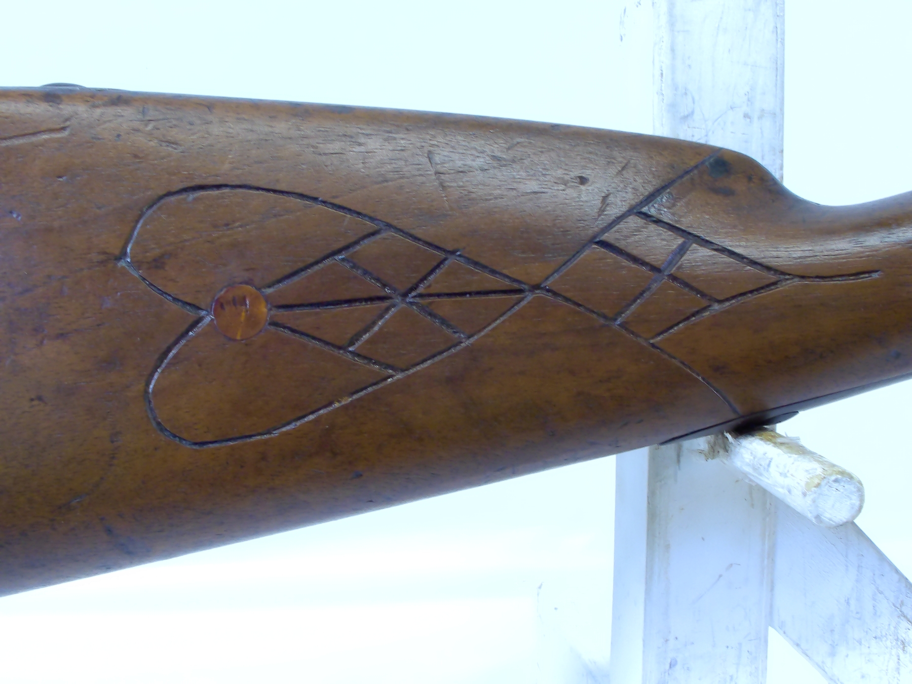 Wood stock shows some scratches & scuffs in various areas, R.F. markings on the butt plate, there are also dents; condition is good for age. The "Holy Water Plug" encompassed by a hand carved "Heart" is part of an old twin rope attached to the front string strap which is all just homemade.