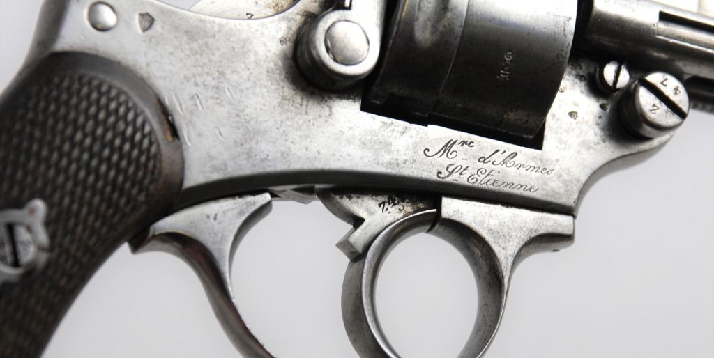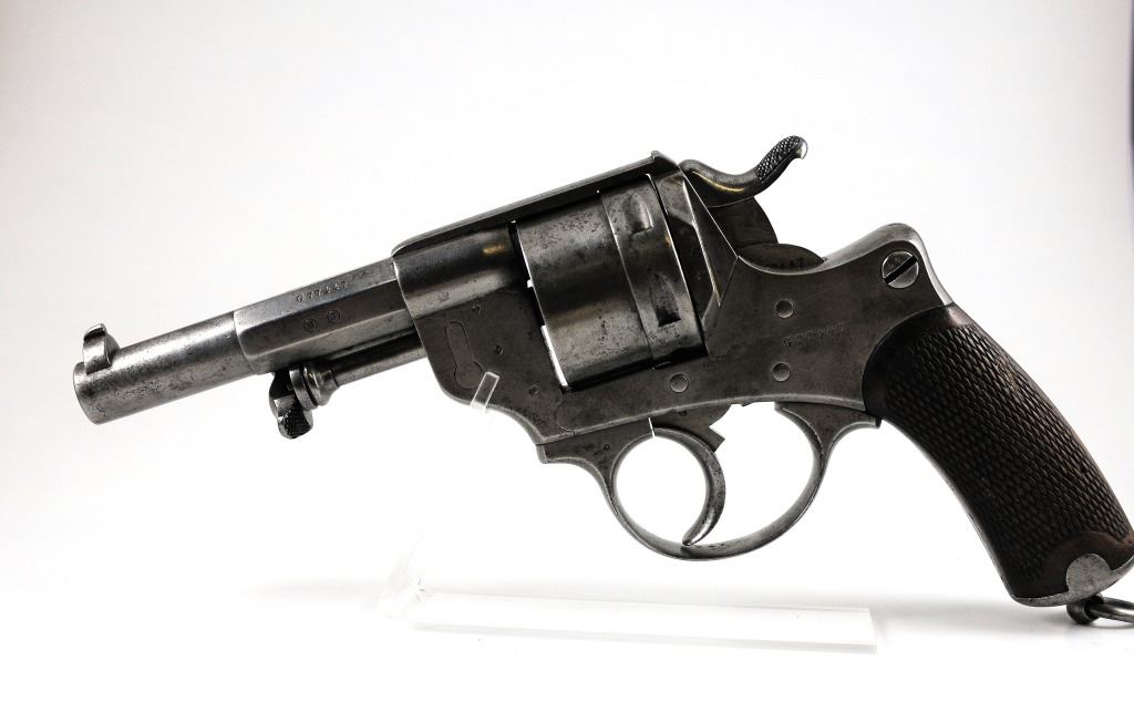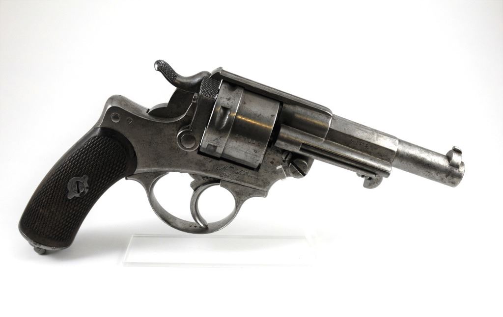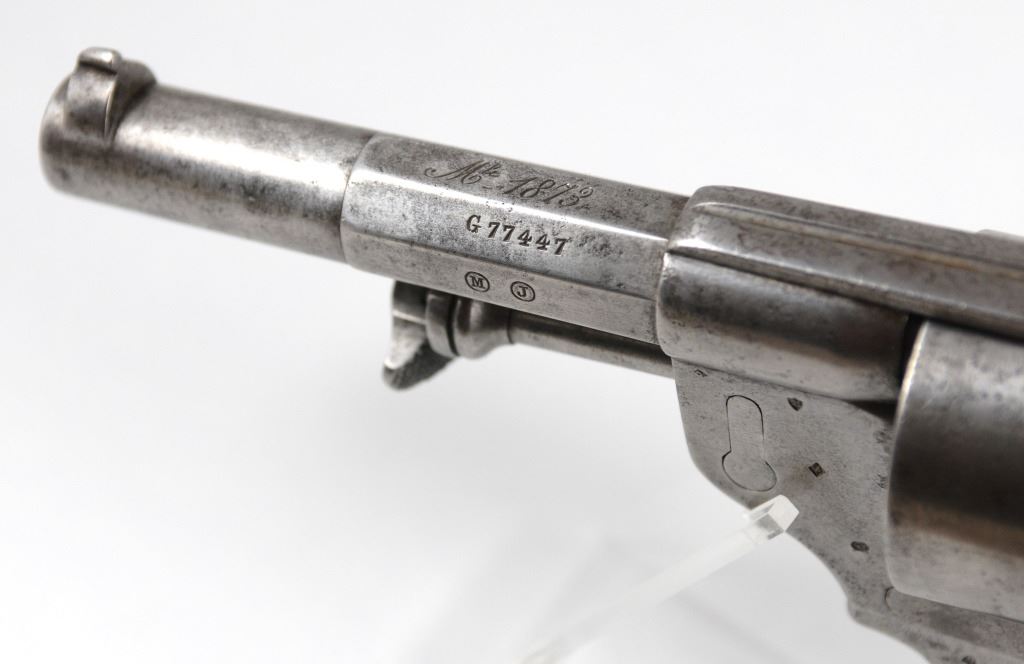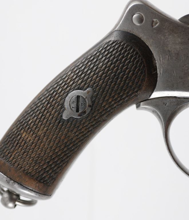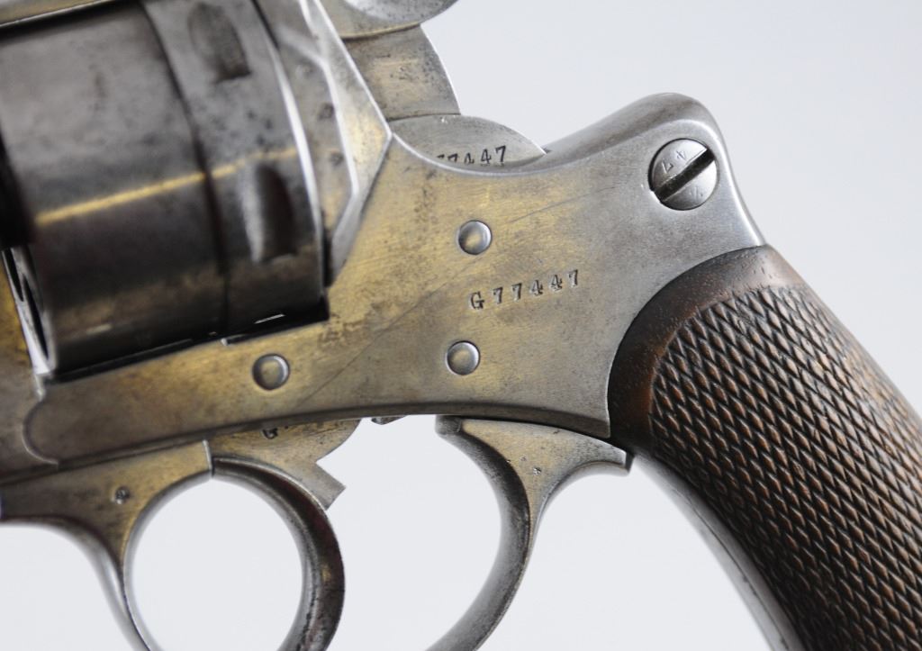 Antique, revolver, 11mm French Ordance, 114mm barrel, SN G77447. Wood grips have some chips, bluing is completely gone, bore pitted. Serial numbers matching.