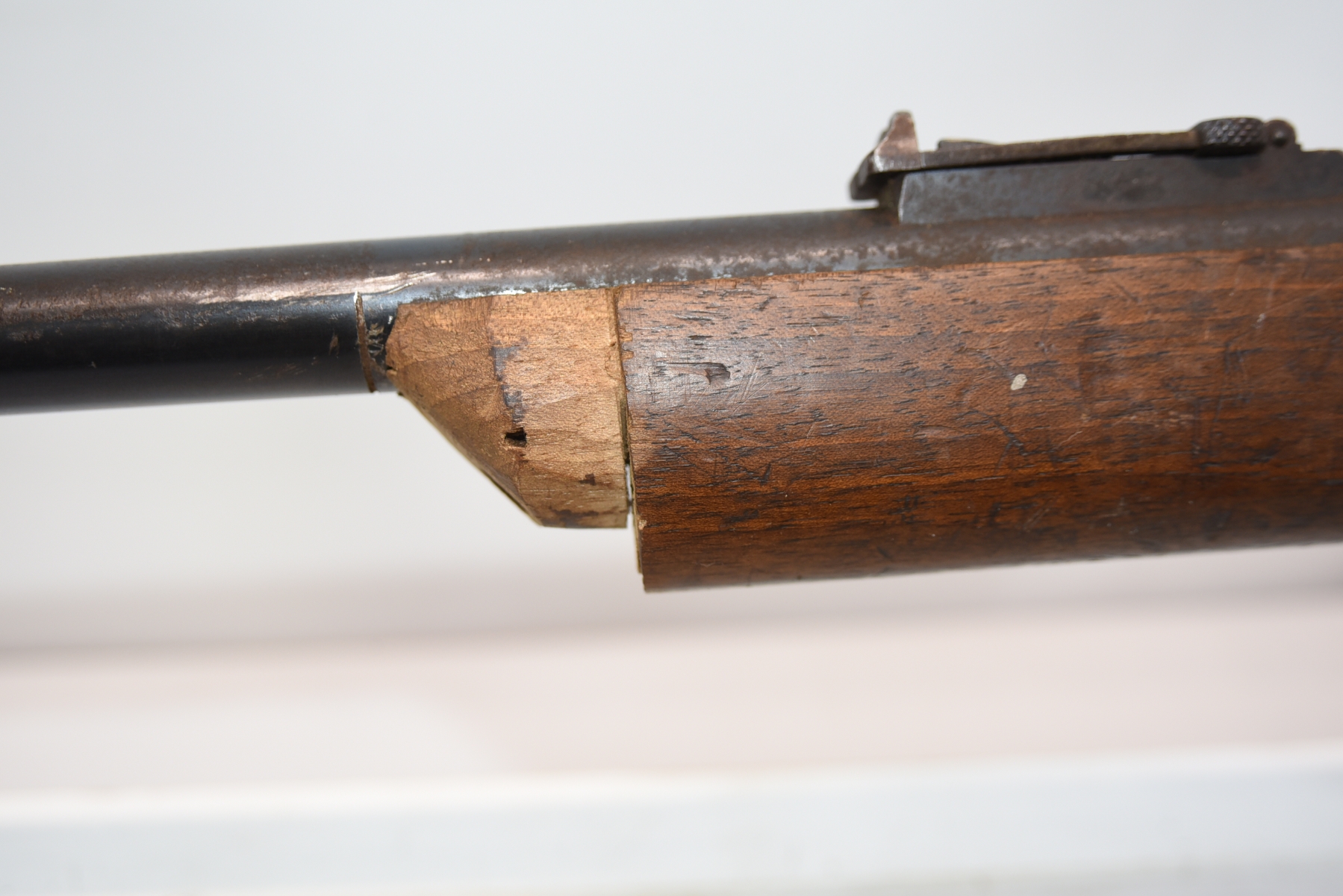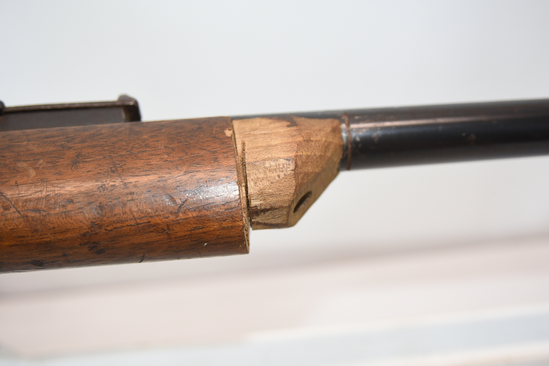 Wood stock shows only a forearm that has a piece broken in the front, scratches, scuffs, dents; condition is poor.