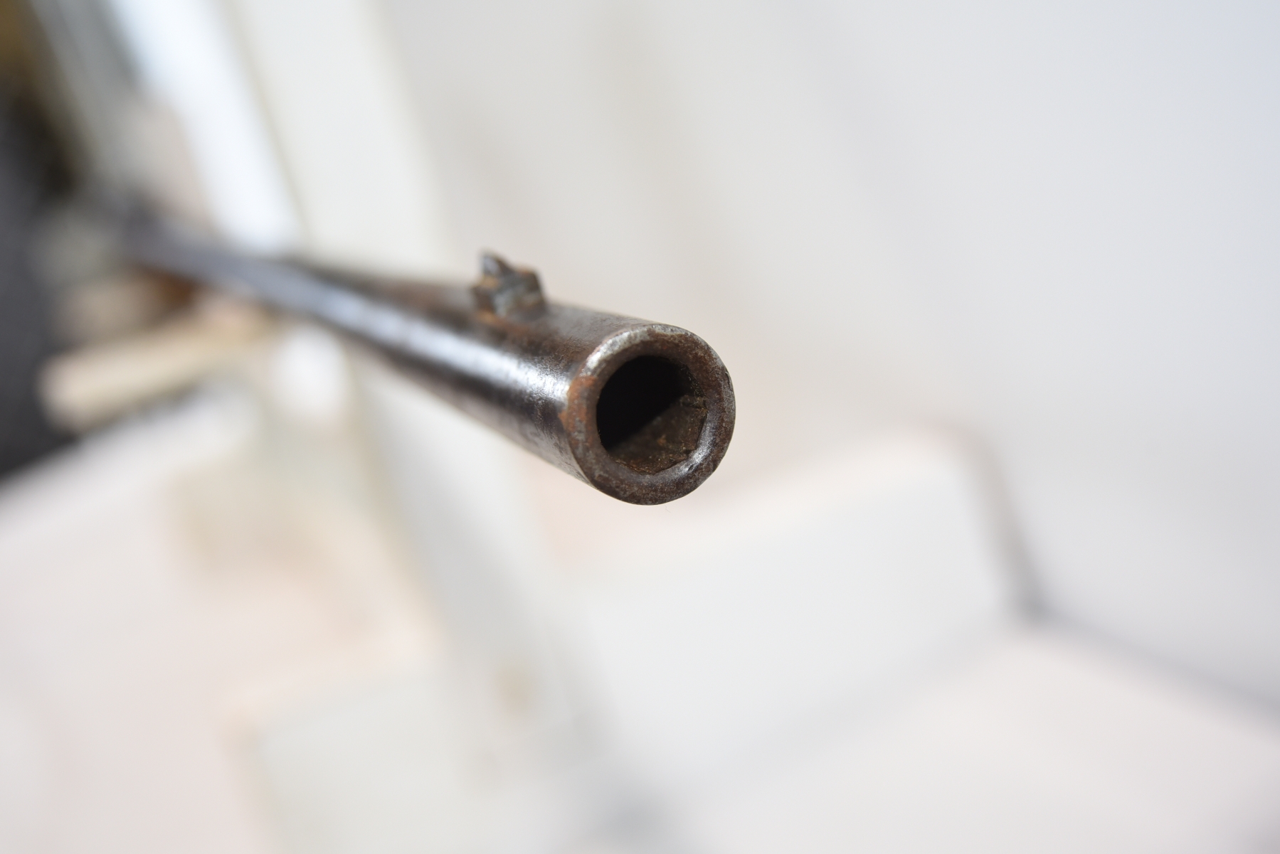 Bore is dark grey, light roughness with some pits and good rifling. Condition is fair for age.