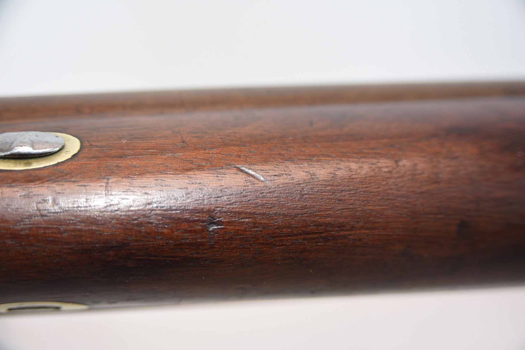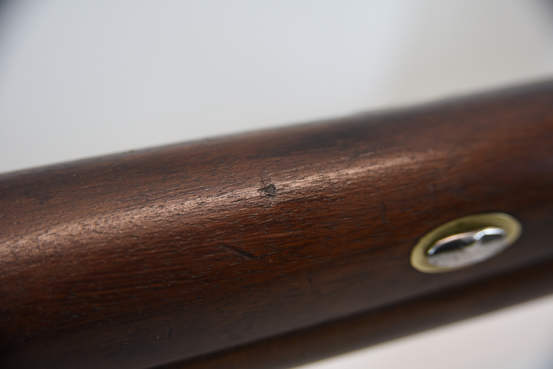 Wood stock shows scratches, scuffs, dents, chip from underside of stock, screws are not original on the lock plates; condition is good for age.