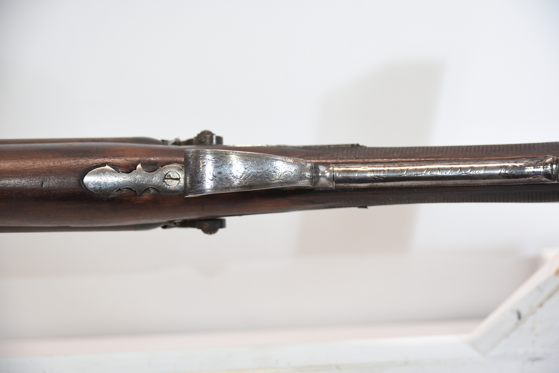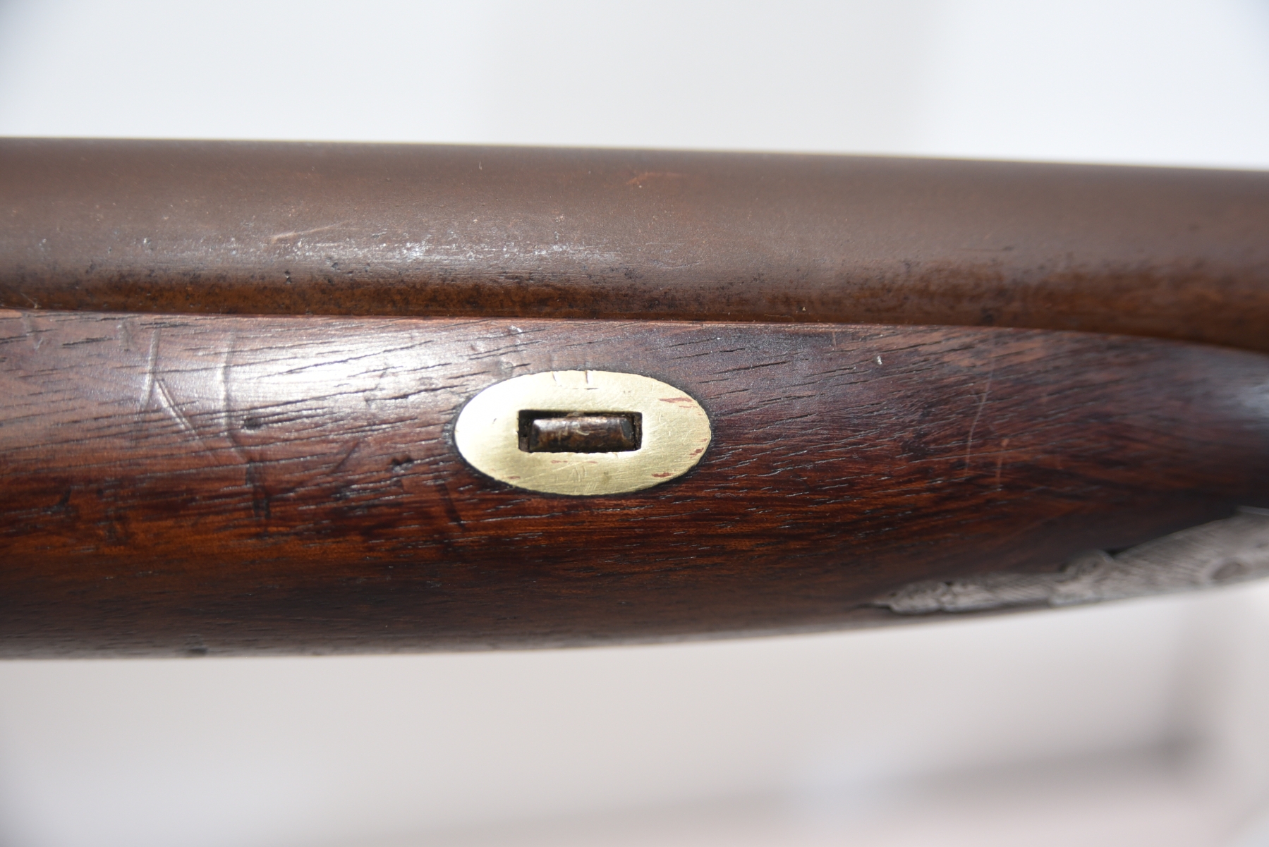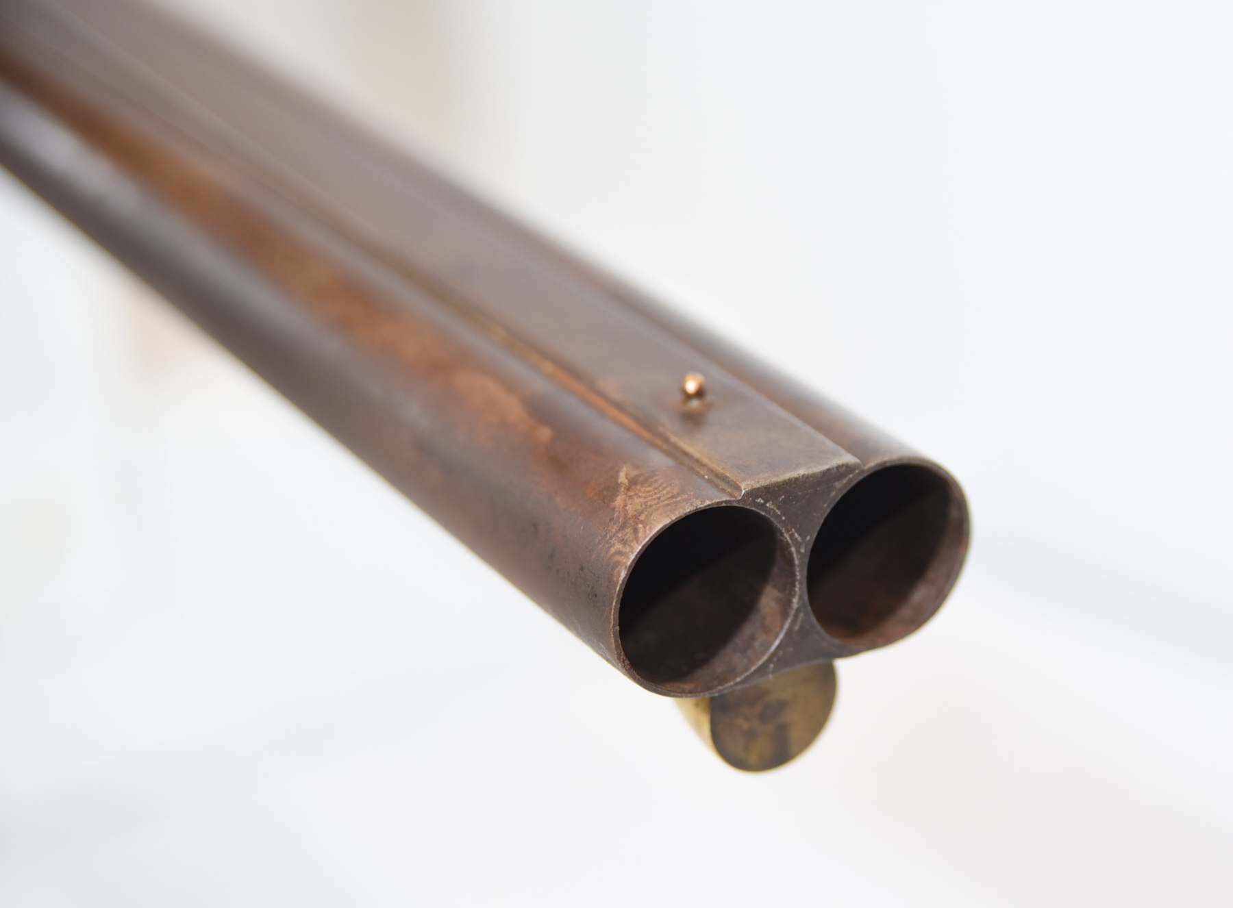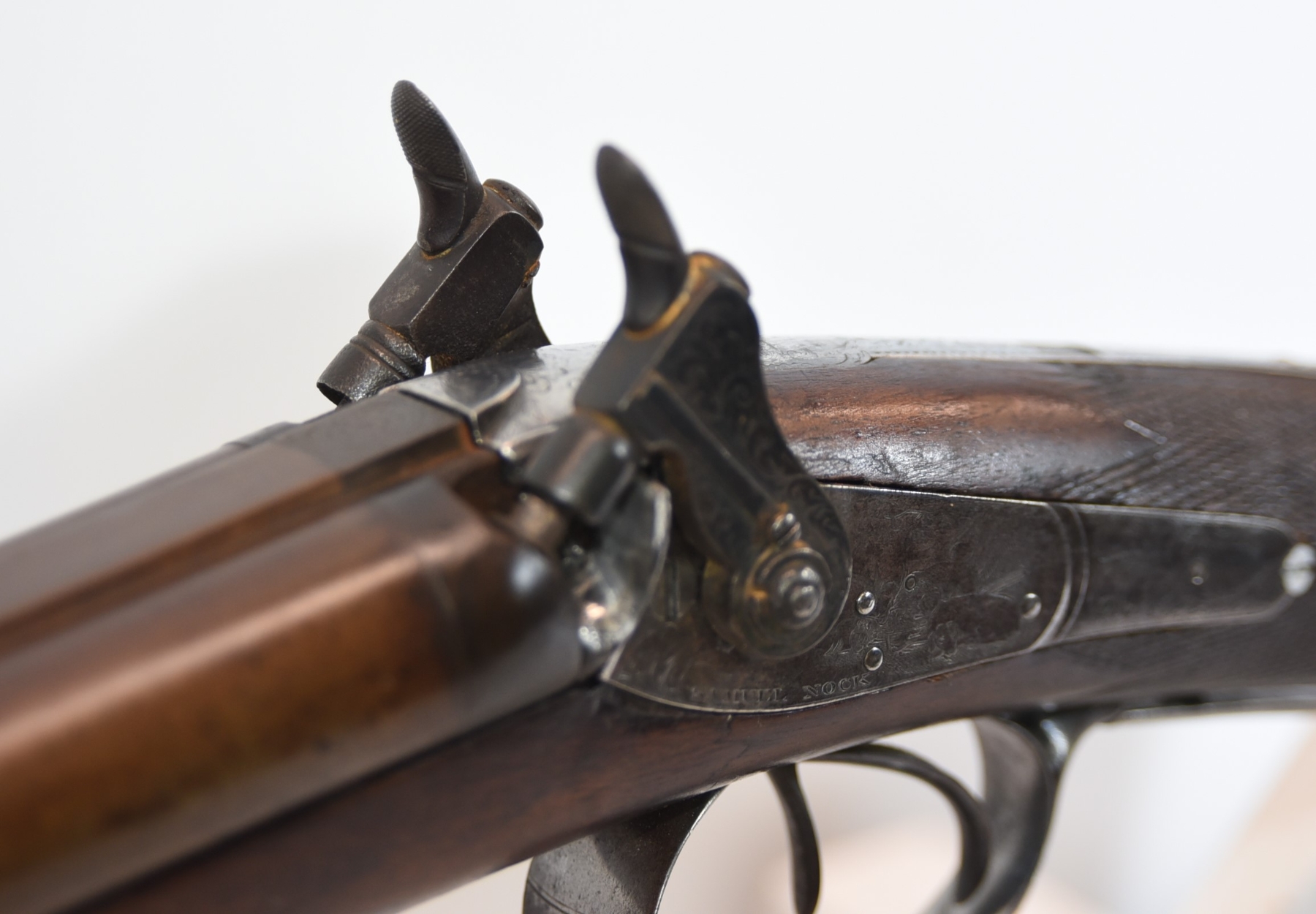 The consignor has asked us to add the following information: Samuel Nock Very Rare SXS. Copper percussion cap containing the detonating composition, now made of three parts of chlorate of potash, two of fulminate of mercury and one of powdered glass. The hollow in the hammer contained the fragments of the cap if it fragmented, reducing the risk of injury to the firer's eyes. While the metal percussion cap was the most popular and widely-used type of primer, their small size made them difficult to handle under the stress of combat or while riding a horse. Accordingly, several manufacturers developed alternative, "auto-priming" systems. The "Maynard tape primer", for example, used a roll of paper "caps" much like today's toy cap gun. The Maynard tape primer was fitted to some military firearms used in the American Civil War. Other disc or pellet-type primers held a supply of tiny fulminate detonator discs in a small magazine. Cocking the hammer automatically advanced a disc into position. This example of Samuel Nock’s SXS shot gun made use of this adaptation on small fulminate disks in the hammer’s head.
