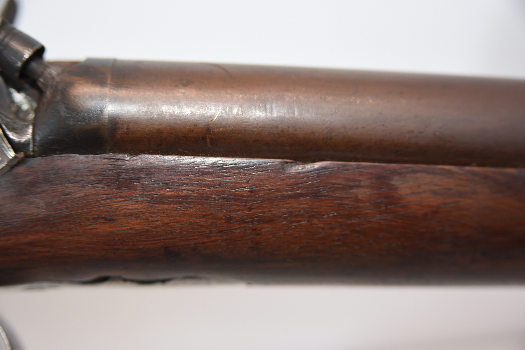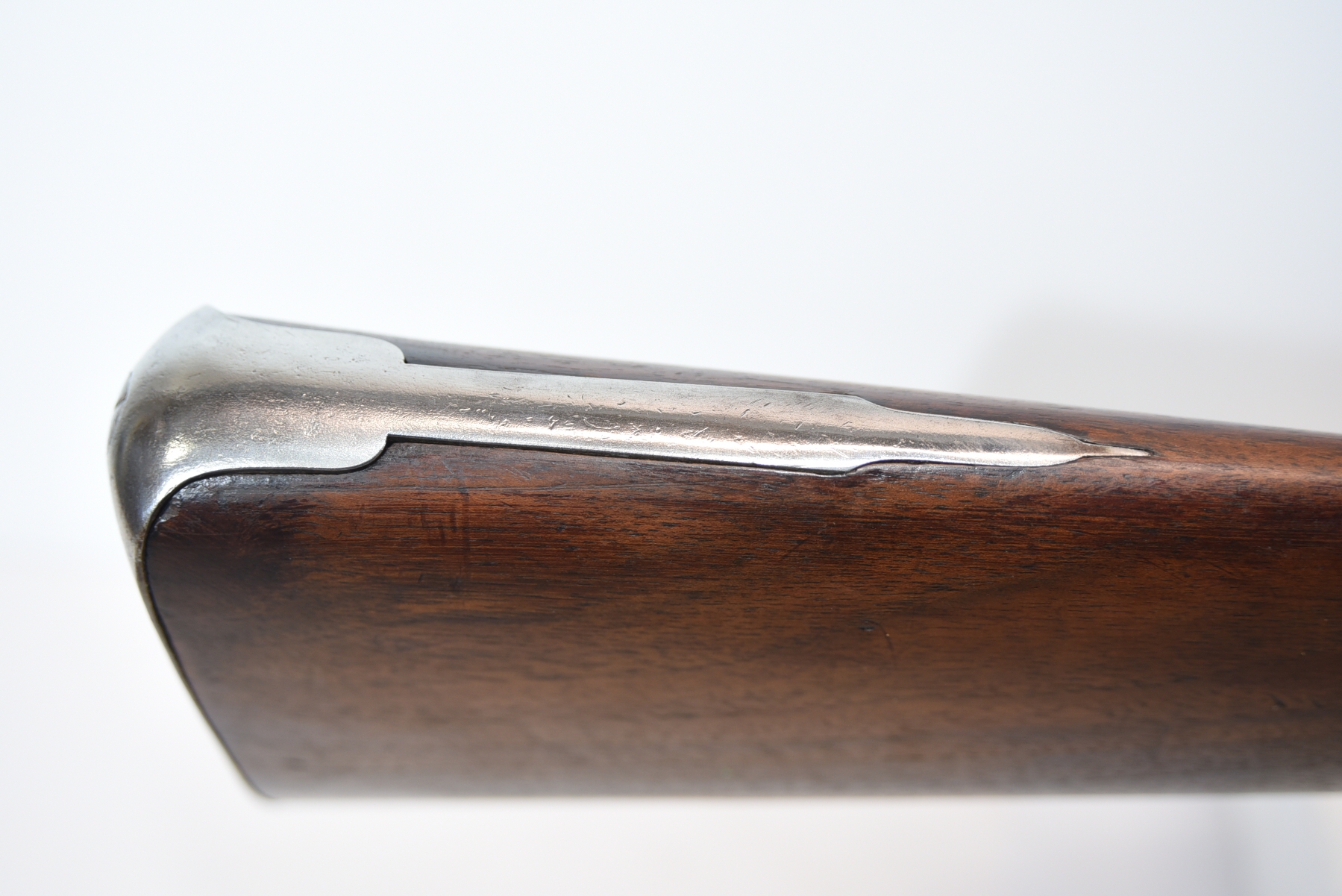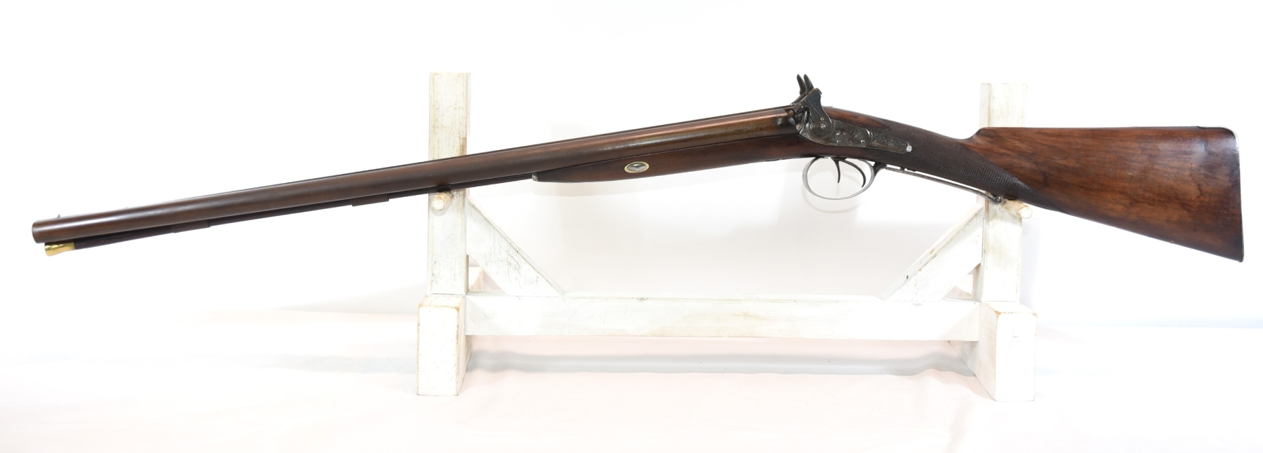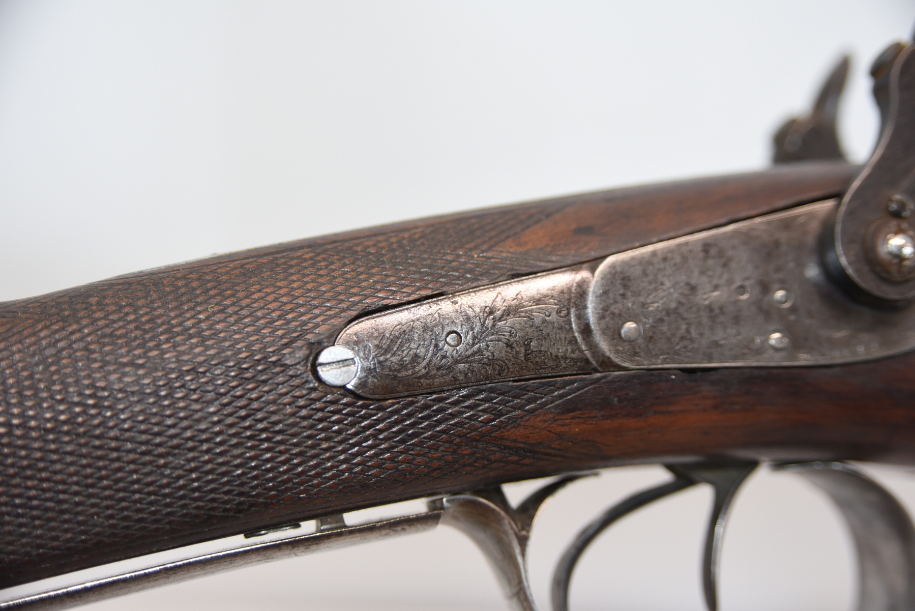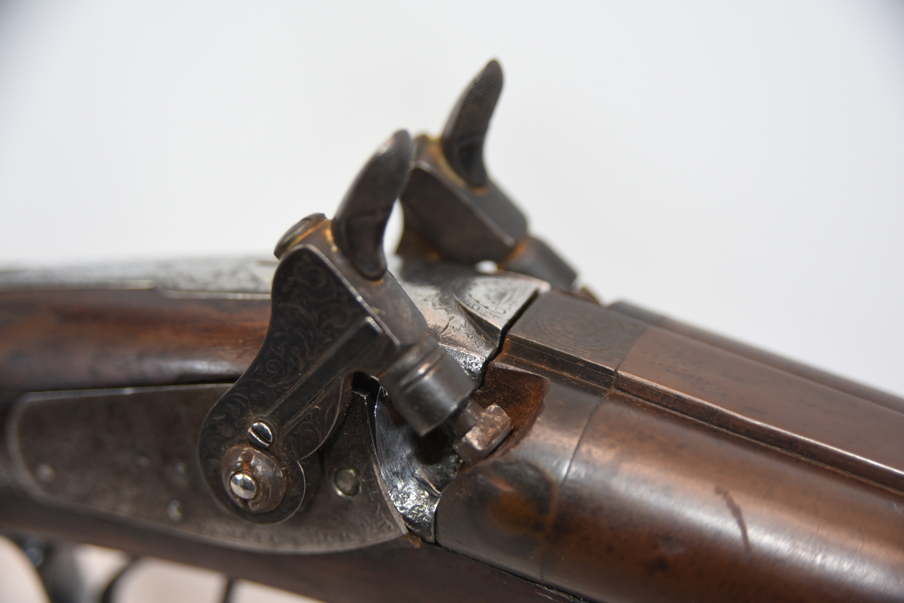 The consignor has asked us to add the following information: Samuel Nock Very Rare SXS. Copper percussion cap containing the detonating composition, now made of three parts of chlorate of potash, two of fulminate of mercury and one of powdered glass. The hollow in the hammer contained the fragments of the cap if it fragmented, reducing the risk of injury to the firer's eyes. While the metal percussion cap was the most popular and widely-used type of primer, their small size made them difficult to handle under the stress of combat or while riding a horse. Accordingly, several manufacturers developed alternative, "auto-priming" systems. The "Maynard tape primer", for example, used a roll of paper "caps" much like today's toy cap gun. The Maynard tape primer was fitted to some military firearms used in the American Civil War. Other disc or pellet-type primers held a supply of tiny fulminate detonator discs in a small magazine. Cocking the hammer automatically advanced a disc into position. This example of Samuel Nock’s SXS shot gun made use of this adaptation on small fulminate disks in the hammer’s head.