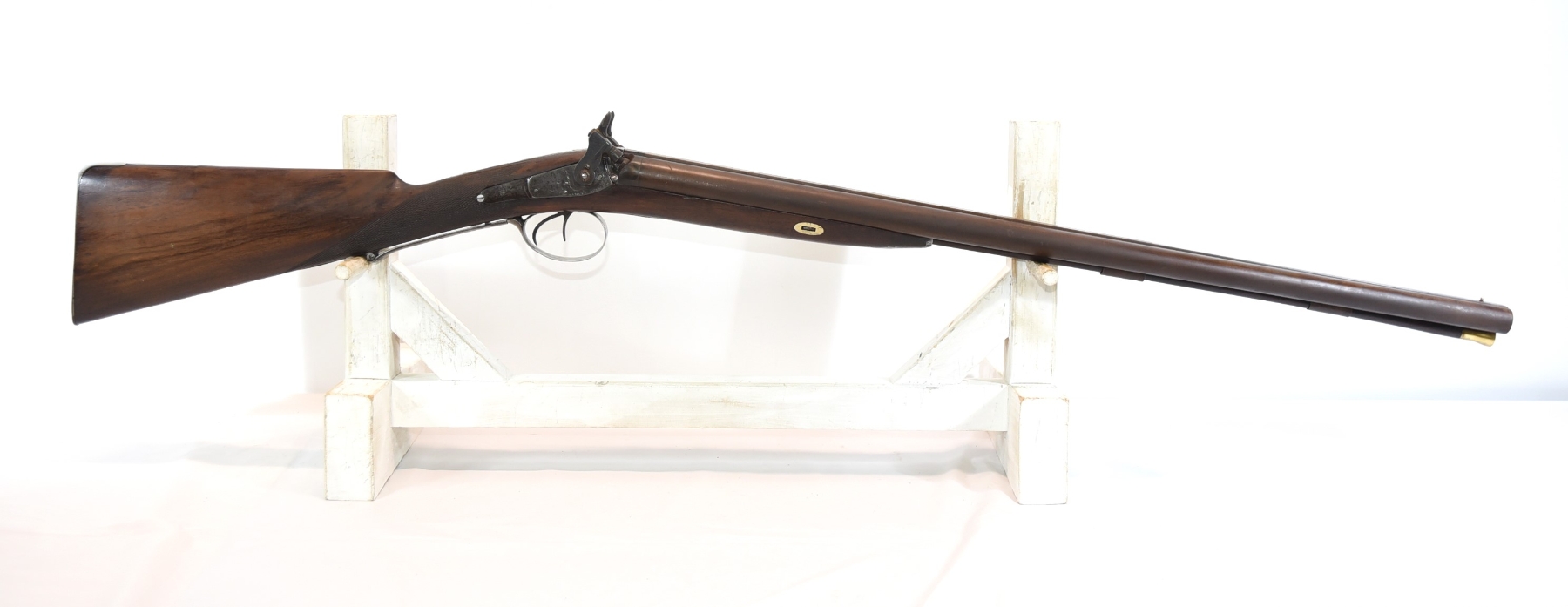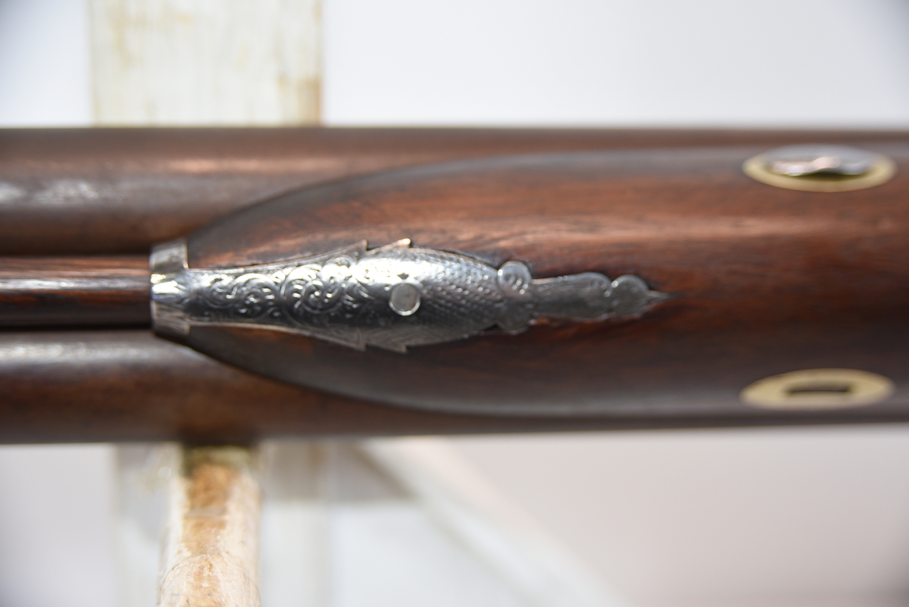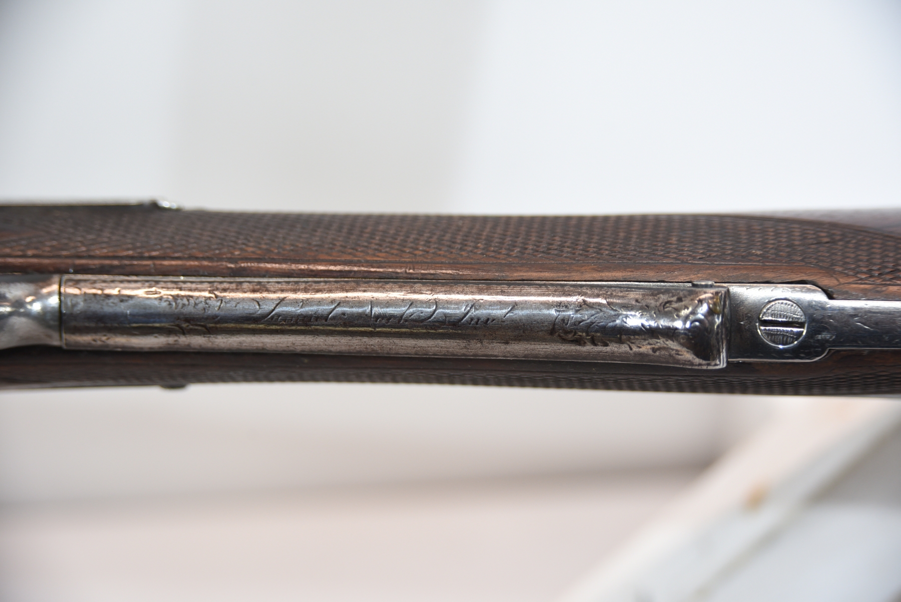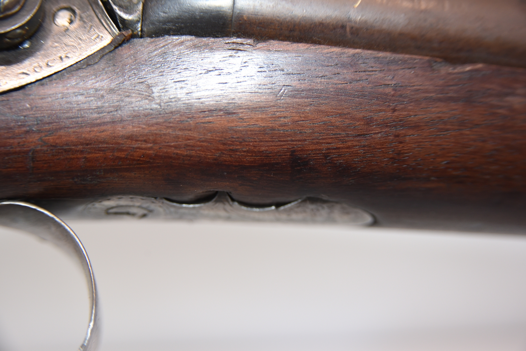 The consignor has asked us to add the following information: Samuel Nock Very Rare SXS. Copper percussion cap containing the detonating composition, now made of three parts of chlorate of potash, two of fulminate of mercury and one of powdered glass. The hollow in the hammer contained the fragments of the cap if it fragmented, reducing the risk of injury to the firer's eyes. While the metal percussion cap was the most popular and widely-used type of primer, their small size made them difficult to handle under the stress of combat or while riding a horse. Accordingly, several manufacturers developed alternative, "auto-priming" systems. The "Maynard tape primer", for example, used a roll of paper "caps" much like today's toy cap gun. The Maynard tape primer was fitted to some military firearms used in the American Civil War. Other disc or pellet-type primers held a supply of tiny fulminate detonator discs in a small magazine. Cocking the hammer automatically advanced a disc into position. This example of Samuel Nock’s SXS shot gun made use of this adaptation on small fulminate disks in the hammer’s head.